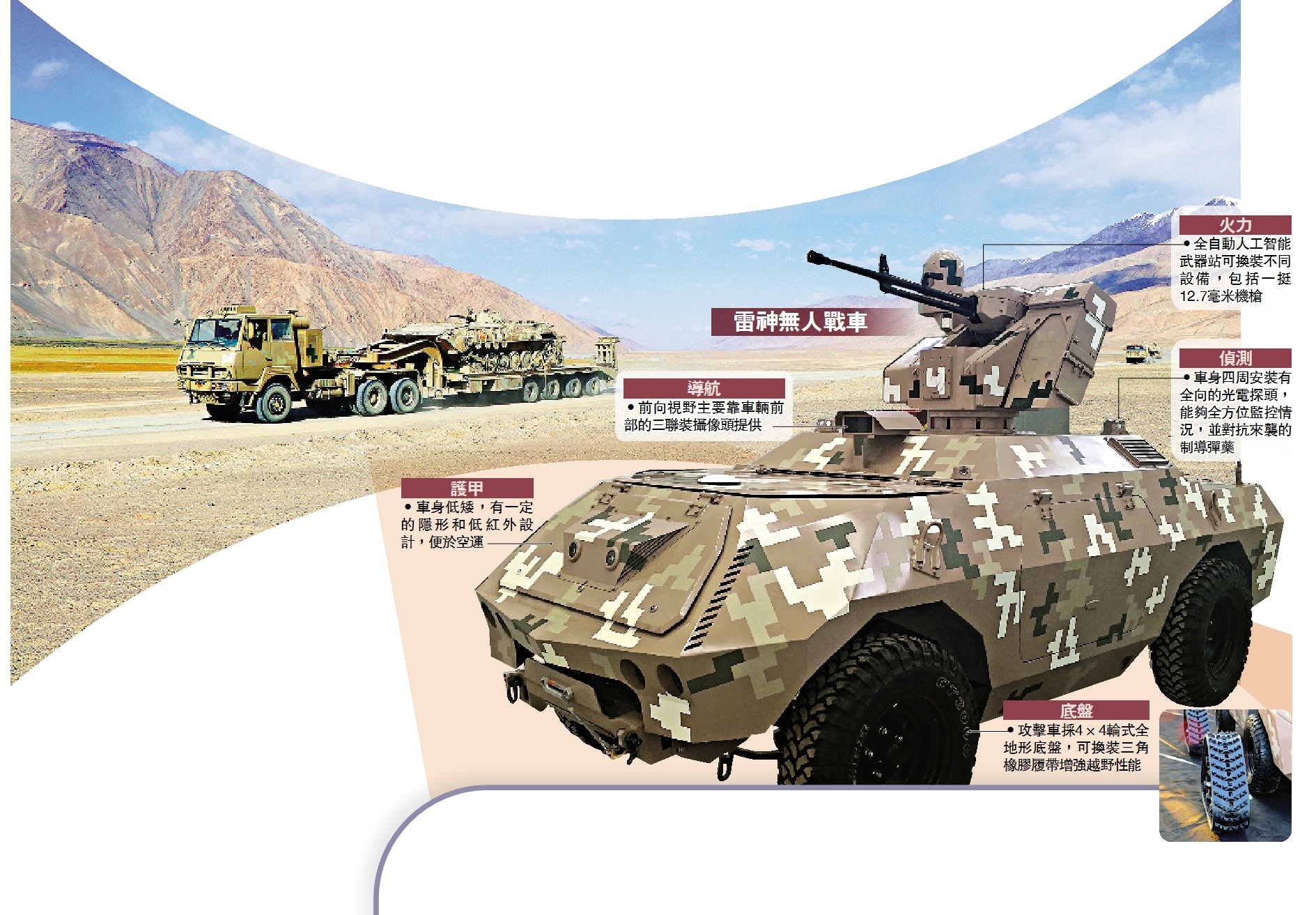(大公報記者 馬浩亮(文))近期解放軍陸軍部隊演練中,擔任開路先鋒的無人打擊車大顯身手。該款融火力壓制和防護於一體的無人打擊車,是由陝西雷神智能裝備有限公司自主研發,可由坦克、裝甲戰車或山貓全地形車駕駛員在後方遠程遙控,輔以人工智能技術下的自主前進,引導步兵分隊向敵方縱深突進,並與空中無人機蜂群相協同,在作戰最前沿構建了一道無人攻防體系。