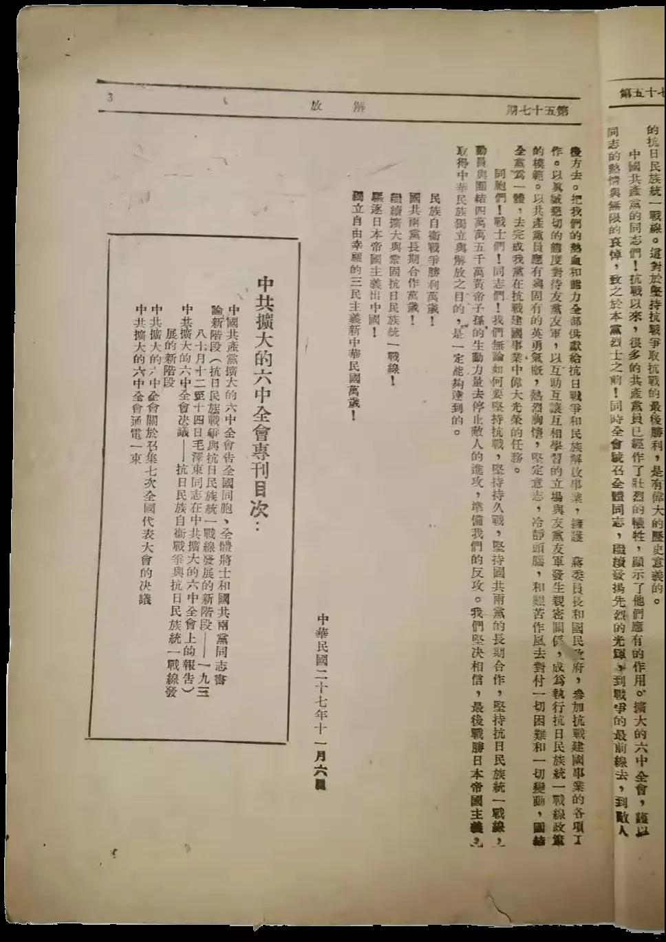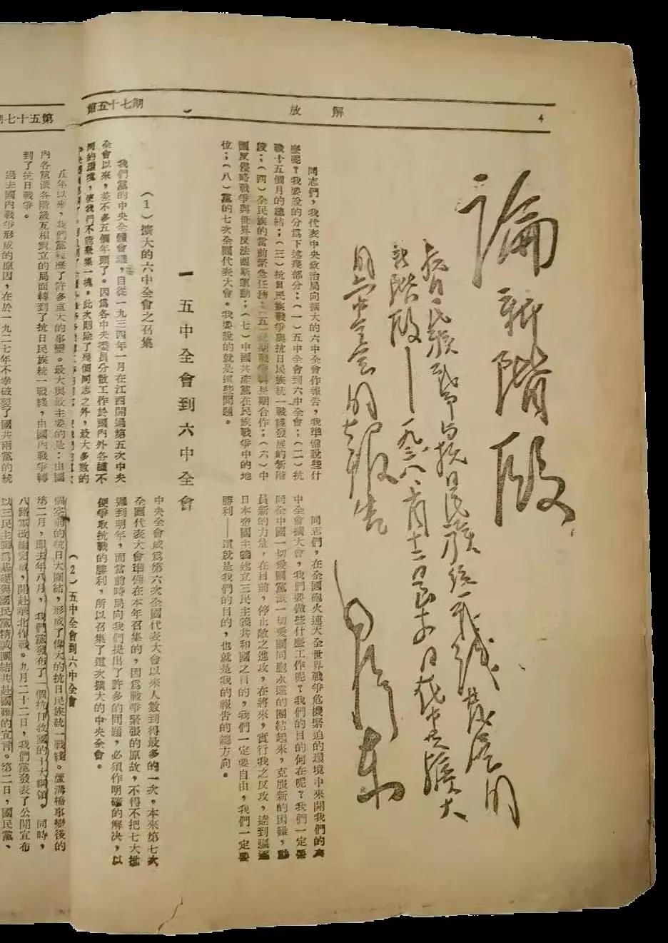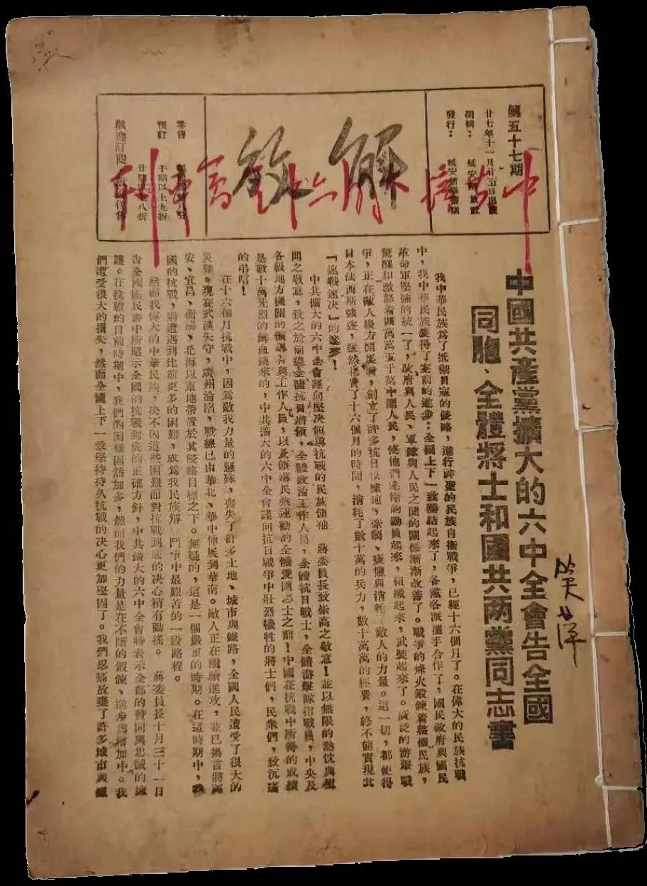 本人收藏的1938年11月25日出版的《解放》第57期,就是最早發表被毛主席稱為「決定中國之命運」的中共擴大的六屆六中全會文獻的一期專刊,毛主席親筆題寫了「中共擴大的六中全會專刊」的刊頭,並且紅色套印。