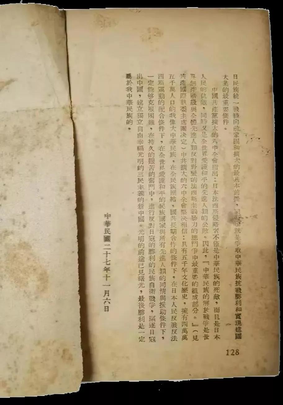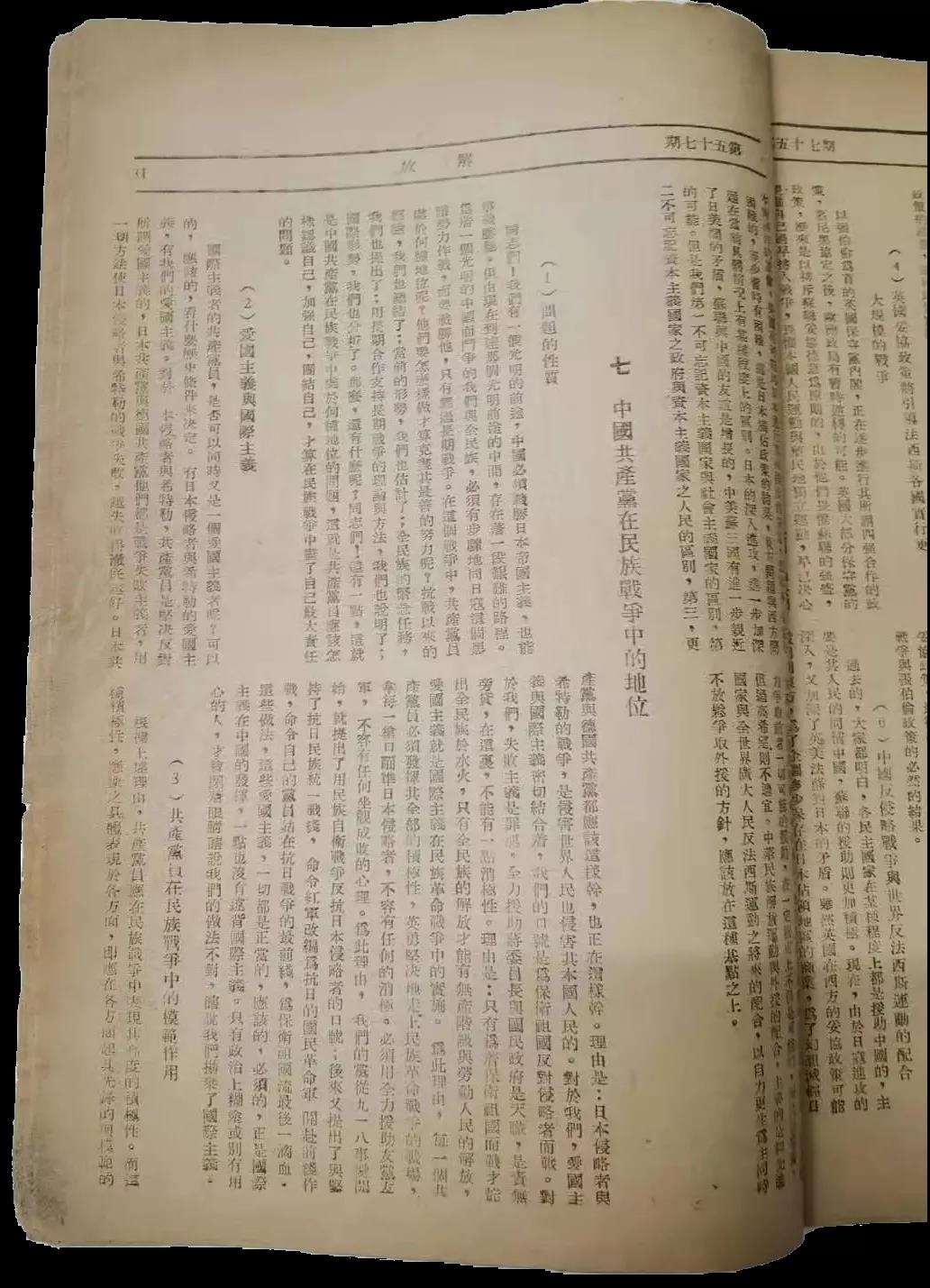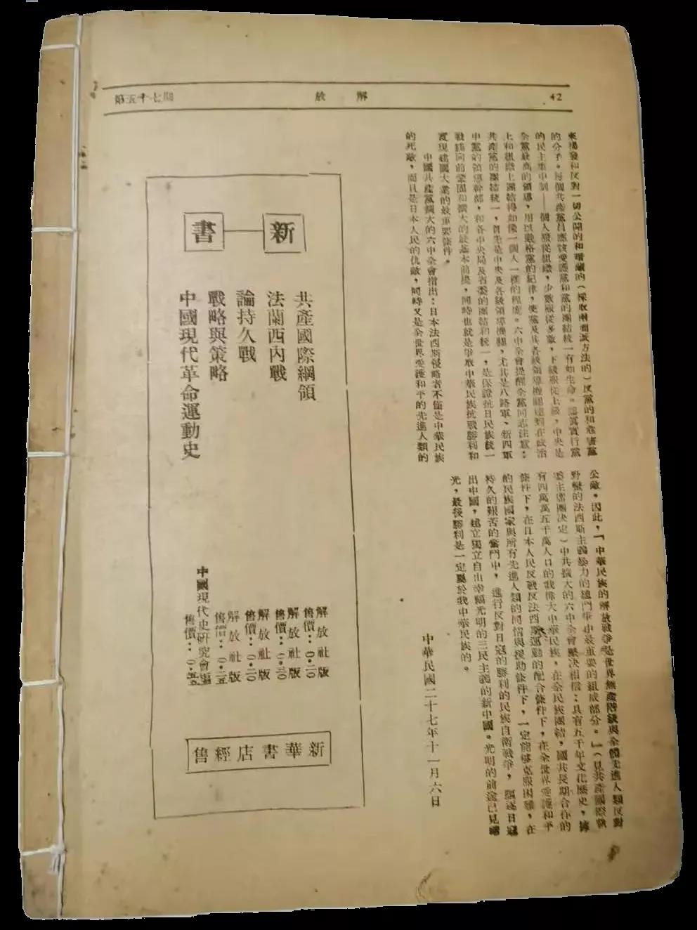 本人收藏的1938年11月25日出版的《解放》第57期,就是最早發表被毛主席稱為「決定中國之命運」的中共擴大的六屆六中全會文獻的一期專刊,毛主席親筆題寫了「中共擴大的六中全會專刊」的刊頭,並且紅色套印。