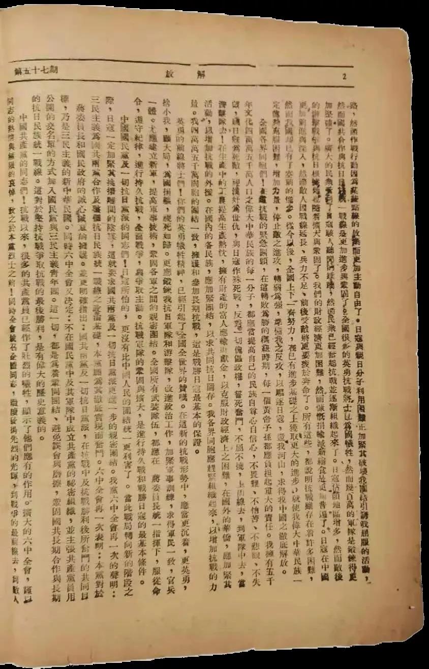 《解放》是當時的中共中央的機關刊物,16開鉛印本,1937年4月24日創刊,誕生在延安藍家坪的窯洞裏,開始為周刊,毛主席題寫了刊名,從1938年1月的第28期起,因無法保證每周按期出版,大體上是10天或半月出一期。該刊是綜合性政治刊物,其主要內容是宣傳共產黨的政策,揭露日本的侵略罪行,介紹國際共產主義運動的發展,也兼有部分文藝作品。除在延安發行外,在各根據地和全國的大城市都設有發行點,因此,在全國影響較大。