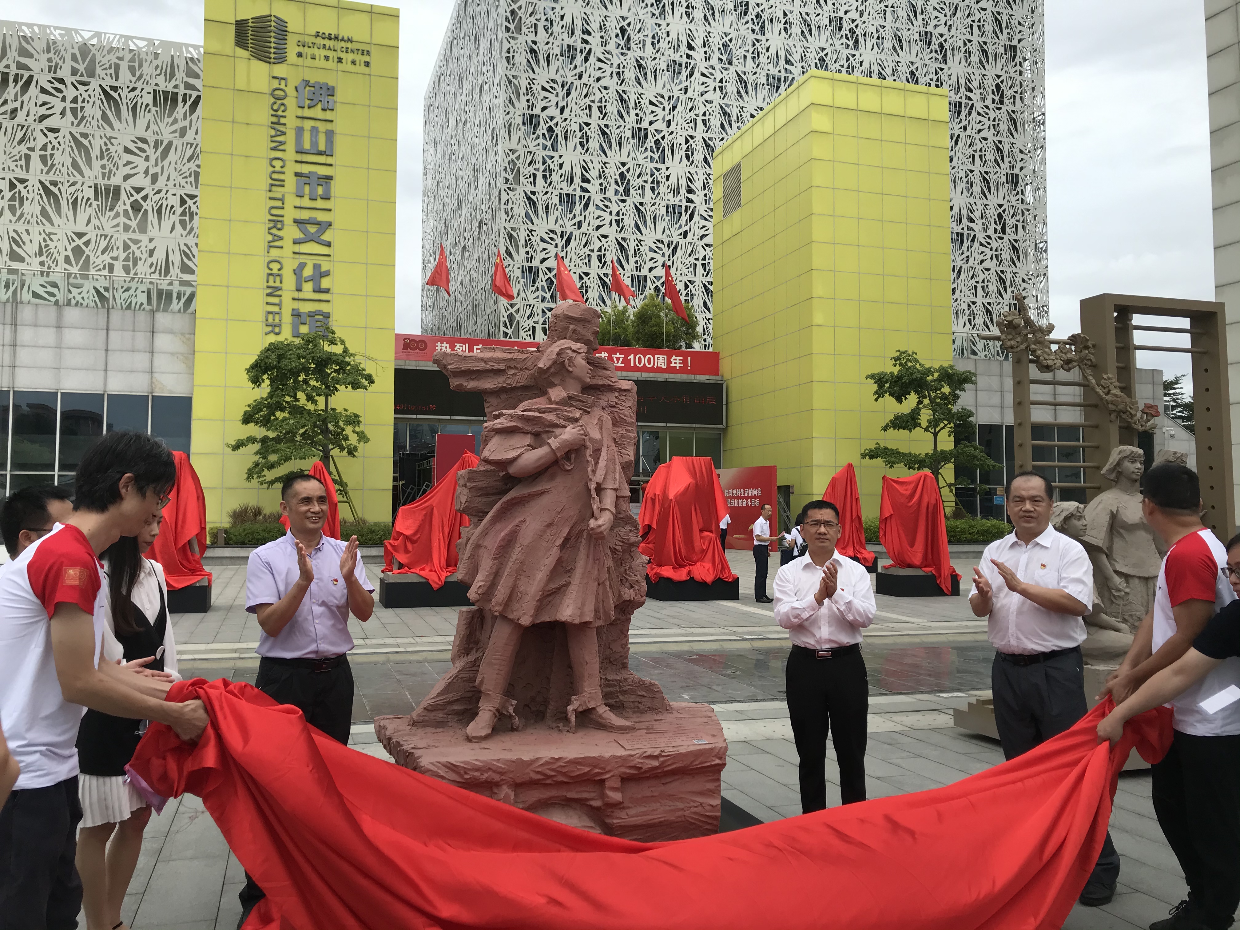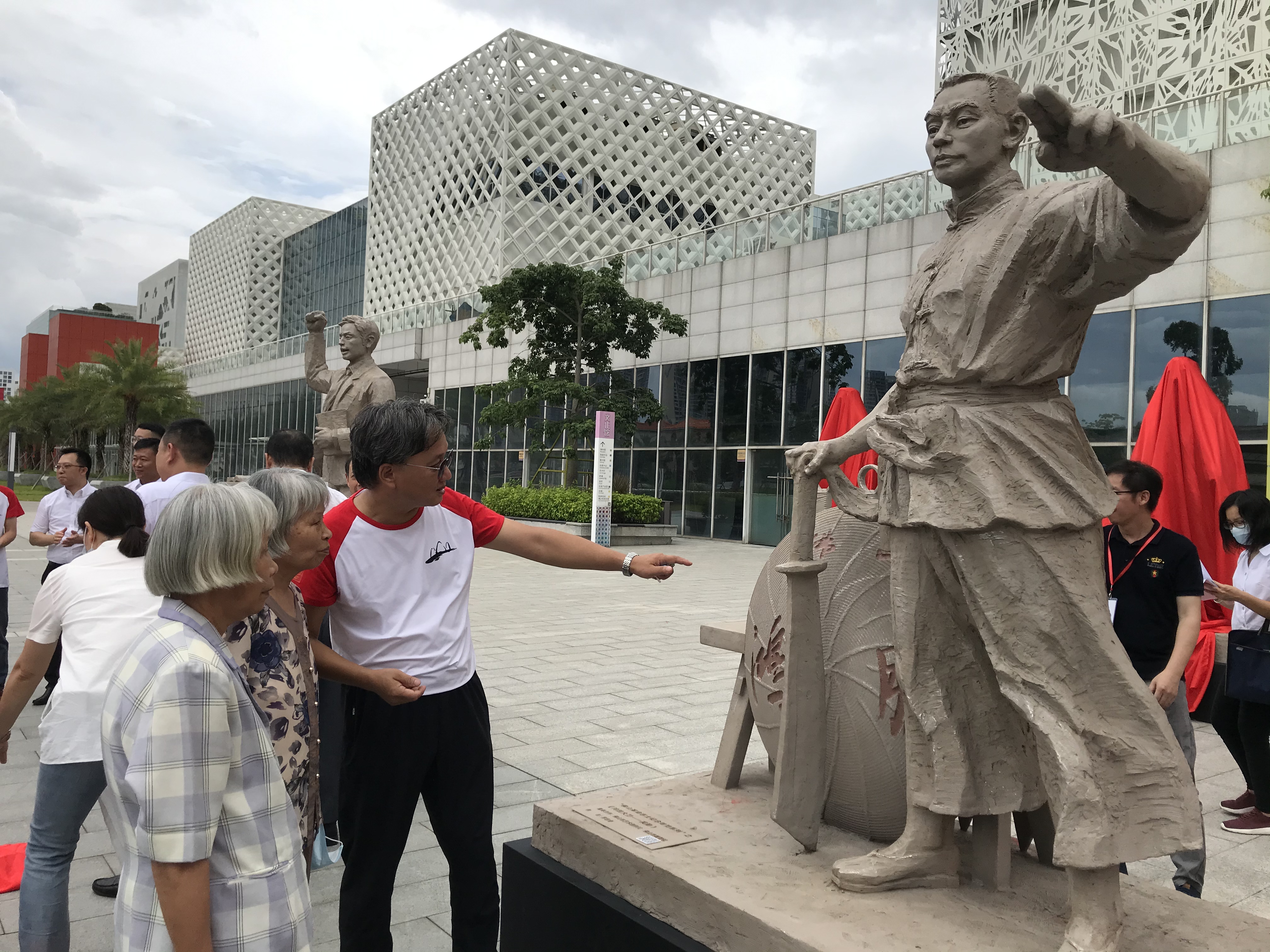 (大公文匯網 記者 敖敏輝)19日,「佛山市慶祝中國共產黨成立100周年美術作品展」在佛山市文化館開幕,以百件作品獻禮百年華誕。其中,在「鐵血丹心永向黨—佛山革命志士紀念雕塑」主題展中,選取了陳鐵軍、陳若克、吳勤、羅登賢等16名佛山具有代表性的革命志士12件(組)雕塑作品。《血奶母親 • 陳若克》、《囚車上的婚禮 • 伍仲文、蔡博真》、《鴻勝大刀 • 吳勤》、等,一幅幅形象的雕塑,刻畫出革命志士捨生忘死、前赴後繼,為民族解放獻出生命的感人故事。當天,包括吳勤烈士雙胞胎女兒吳萬紫、吳千紅等烈士的後人、親屬親自到場見證。