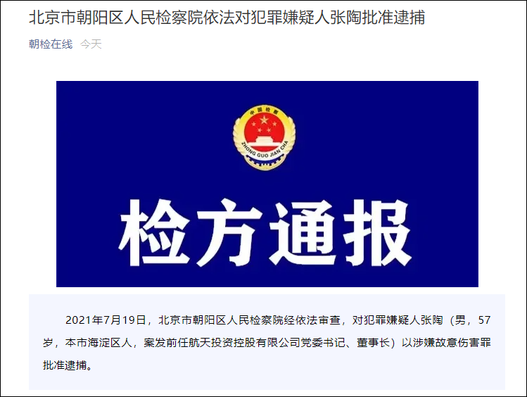 關鍵詞:中國航天科技集團黨籍政務故意傷害罪批准逮捕張陶