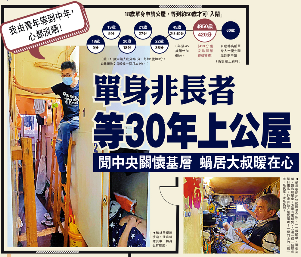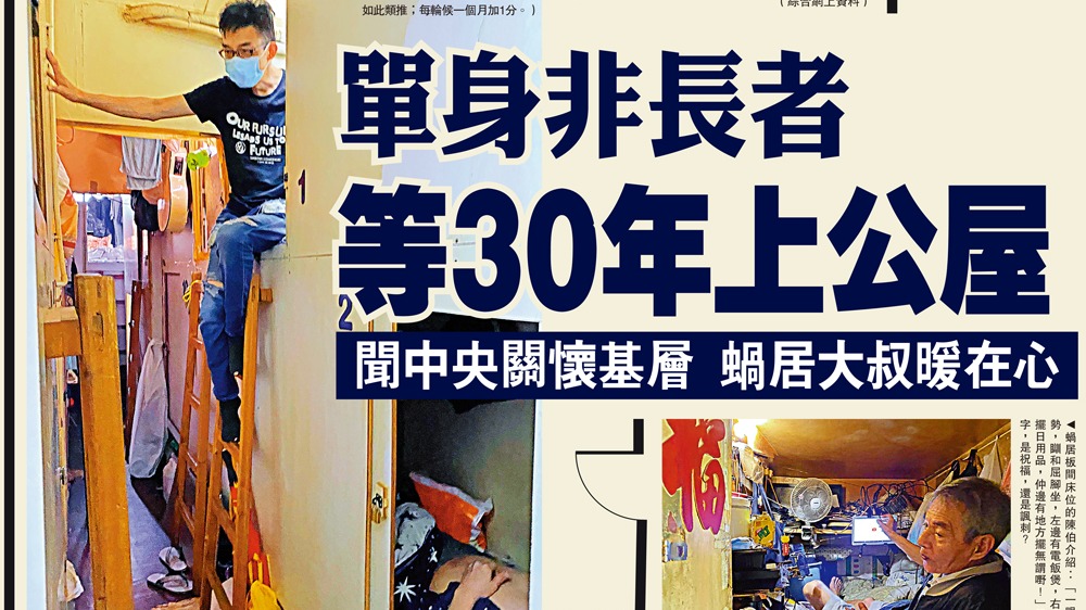 這位蝸居大叔日前看新聞,知道中央領導人提到香港的劏房、籠屋,關心基層住屋問題,感覺很暖心。他希望政府加快興建公屋,別讓他等到白髮才圓上樓夢。