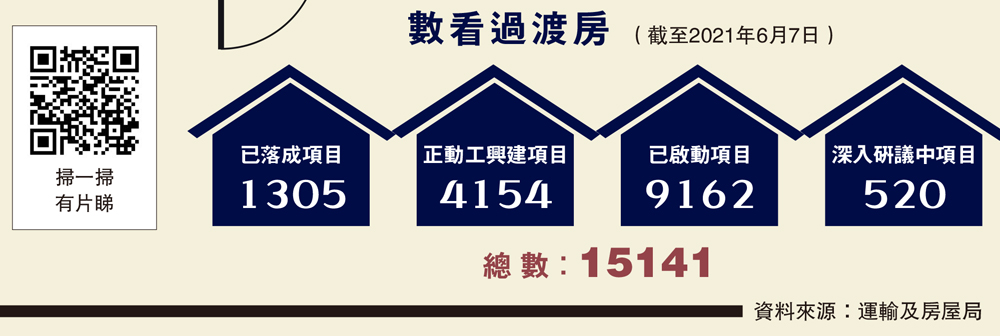根據統計,居住在不適切住屋(包括劏房、板間房、籠屋等)住客人數不斷上升,現時超過22.6萬人。政府於2019年推出過渡性房屋計劃,以紓緩等上公屋劏房戶的困苦,當時以九萬劏房戶做基數,擬在三年內興建一萬個過渡房,一年過後,參看運房局的資料,截至2021年6月7日目標已敲定為15141個,但已落成的過渡性房屋只有1305個,不足一成,而正動工興建的有4154個,啟動項目則有9162個,進度遠遜預期。