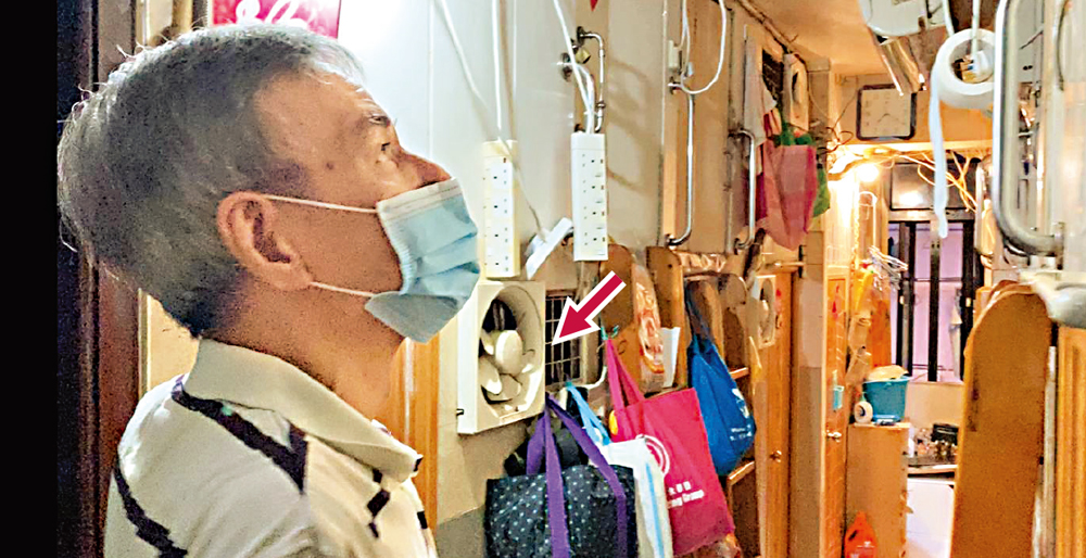 板間房的單位走廊裝有冷氣機,但並非每一室都能夠有「福氣」分享得到。炎熱難耐,居住在較為遠離冷氣機的住客,會在板間床位安裝抽氣扇(箭嘴示),將走廊的冷氣抽入木板床位內,盼能分享到一絲冷氣解暑。