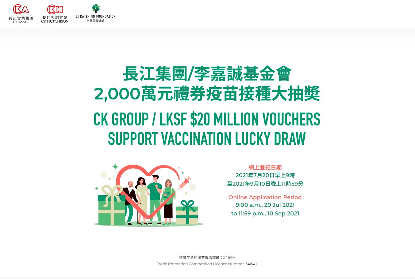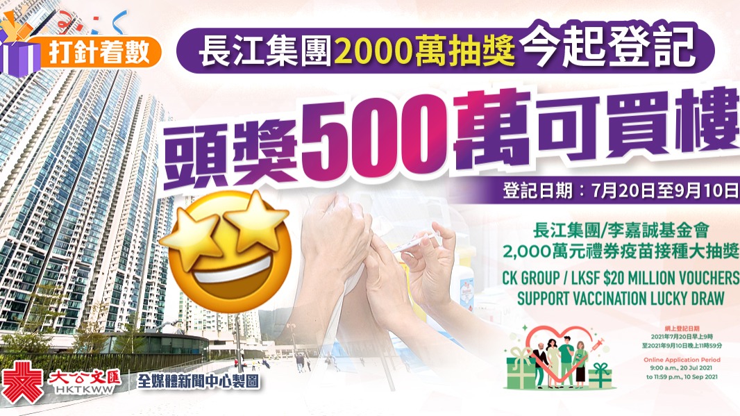 大公文匯全媒體報道,為鼓勵本港市民踴躍接種新冠疫苗,各機構紛紛推出獎賞優惠。長江實業集團有限公司、長江和記實業有限公司聯同李嘉誠基金會早前宣布,將透過大抽奬送出一系列總值港幣2000萬元的精選禮券予完成接種疫苗的市民。今日(20日)早上9時起至9月10日晚上11時59分接受登記,而大抽獎將於9月13日舉行,並於9月20日公布結果。(點此可登記抽獎)