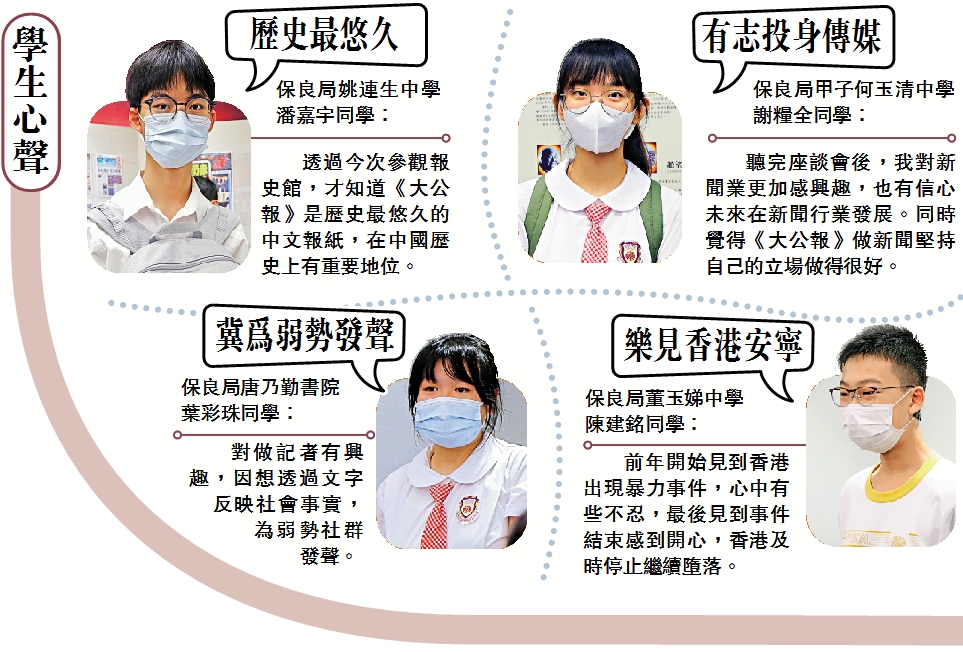 (大公報記者 葉心弦、鍾怡、湯嘉平、馬丁、凱揚)保良局四間屬校34名師生昨日到訪《大公報》,參觀報史館、大文集團全媒體中心及參加座談會。整個座談會充滿正能量,同學們對《大公報》堅守愛國立場深表敬佩,對香港的未來更有信心。