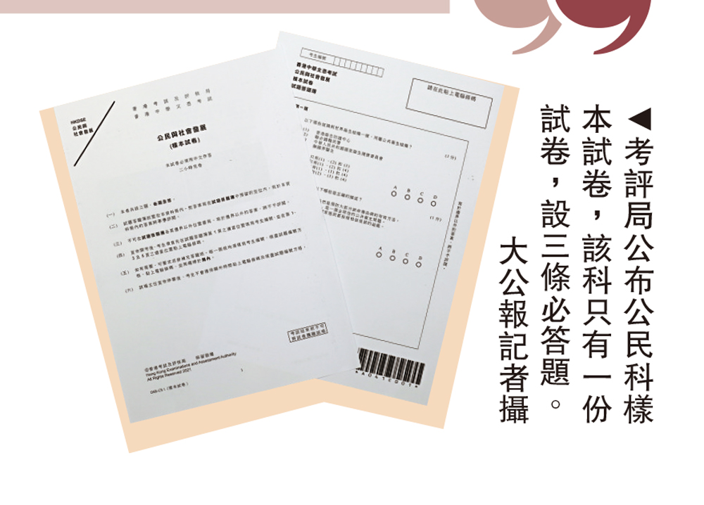 公民與社會發展科將於新學年取代通識科,在中學文憑試中,該科只設一份試卷,分為「達標」與「不達標」兩級。考評局昨日公布公民科樣本試卷,共設三條必答題,題型包括多項選擇題、短答題和長問答,題目分別與疫苗接種、香港國安法及粵港澳大灣區發展有關。有中學生認為,新科目與原來的通識科相比差別很大,認為難度可能更大;亦有中學生認為,三個議題與市民的生活息息相關,只要關心新聞時事,不算太難。