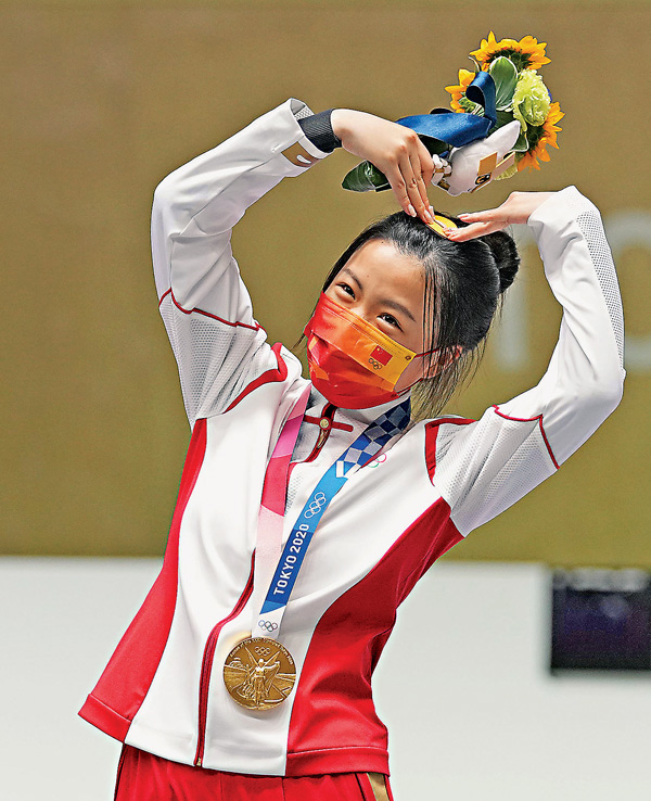 登上領獎台,戴着口罩的楊倩滿眼露出了歡喜,並且對着鏡頭用雙手比了一個心。之後被問及為什麼做這個動作,她俏皮地說:「那時候看到看台上兩個姐姐跟我比心,所以我就也做了這個動作。」