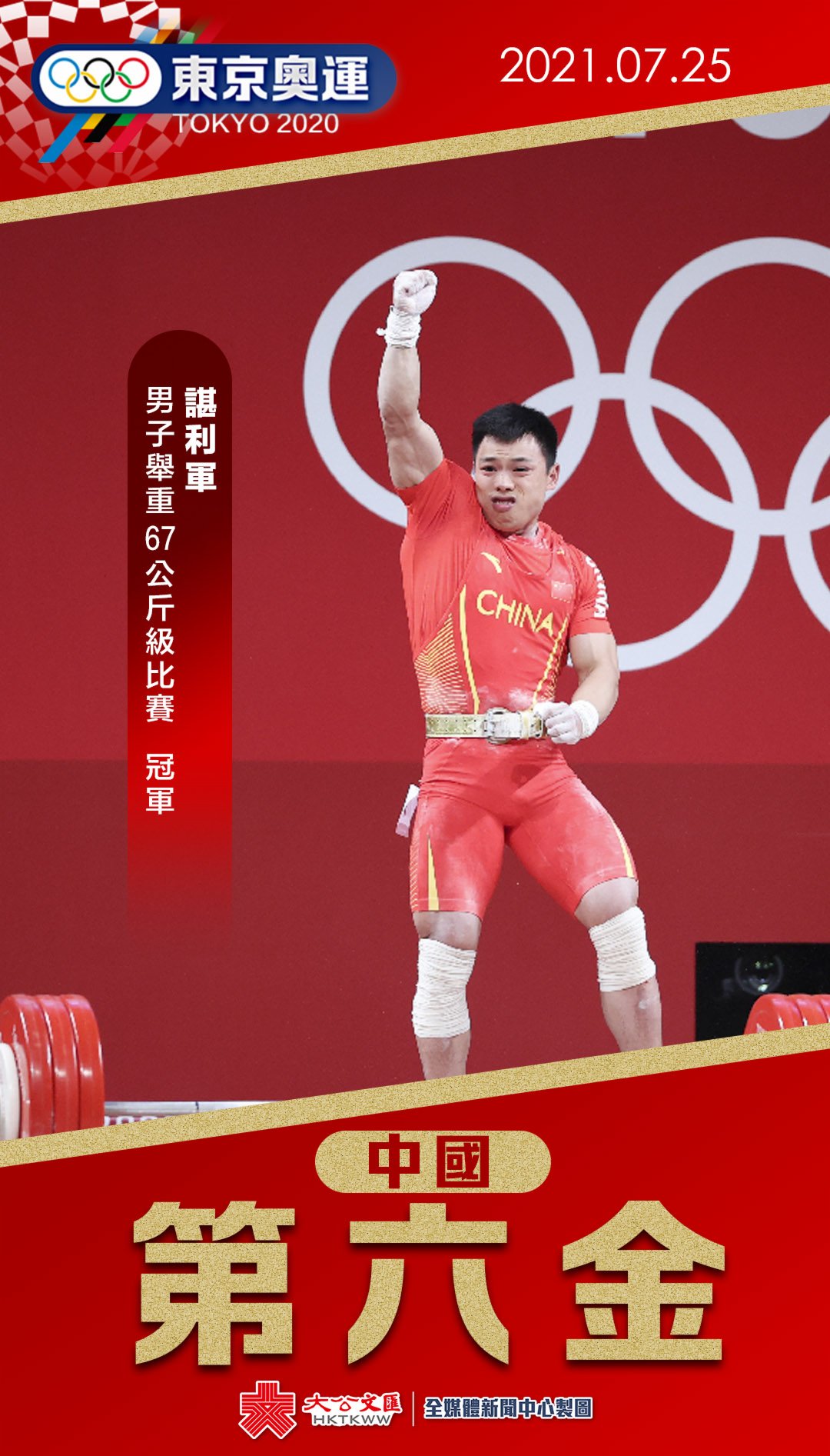 今日(25日),東京奧運會男子舉重67公斤級比賽在東京國際論壇大樓舉行,中國選手諶利軍戰勝來自哥倫比亞的對手莫斯克拉,以抓舉145公斤、挺舉187公斤、總成總成績332公斤獲得金牌,同時總成績亦打破奧運會紀錄。