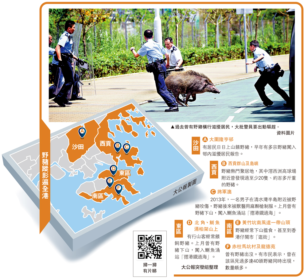 (大公報記者 黃浩輝報道)鰂魚涌繼上月有野豬衝閘搭港鐵後,昨晨更發生野豬咬人事件。一名六旬女行山客行至柏架山腳近街市,突遭一頭疑落山搵食的野豬襲擊,咬傷膝蓋,野豬傷人後速速逃回山上。