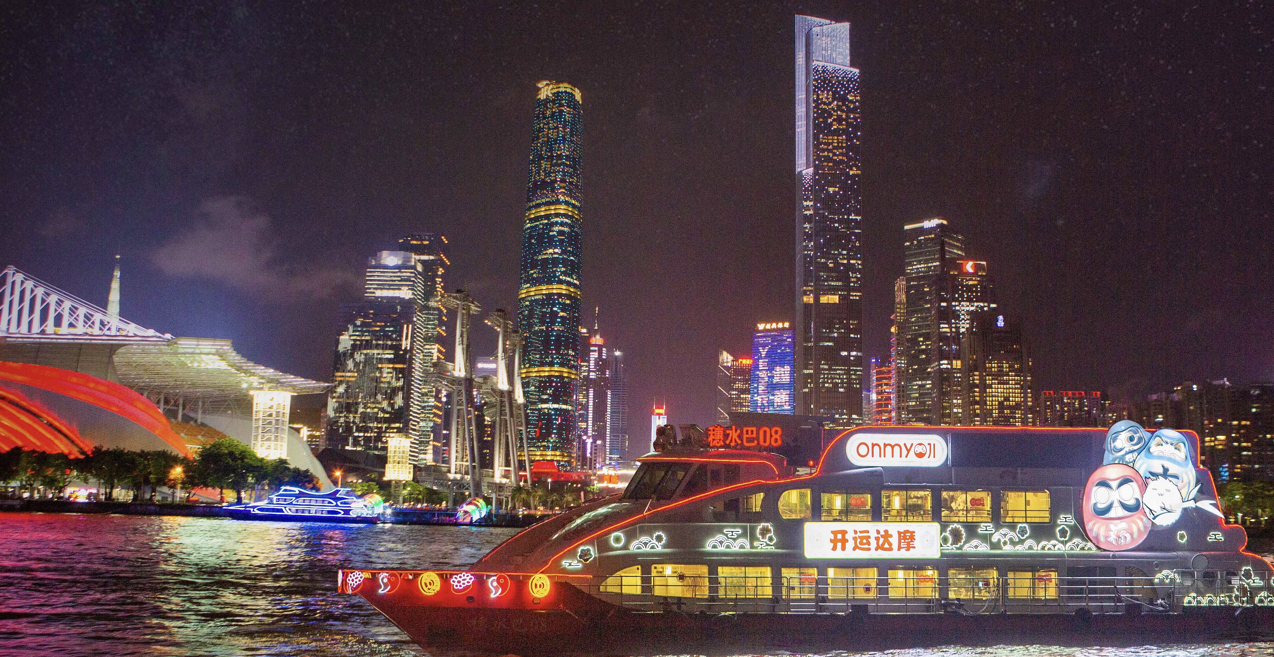 夜遊珠江,還能同時穿越到遊戲中的經典場景。給遊客提供沉浸式的遊船體驗,也讓不少遊客驚嘆,近年來廣州文旅界驚喜頻出。記者獲悉,「開運達摩」主題船還基於《陰陽師》手游世界觀,創新性延展創作「開運達摩」定製主題故事,並圍繞着「開運」的寓意,與遊戲內玩法相結合,設置了豐富的互動內容,意在將滿滿的好運與福氣帶給每一位乘客和玩家,為乘客和玩家帶來一場獨具特色的東方「綺幻」之旅。
