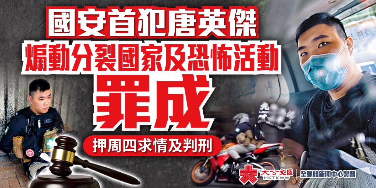 (香港文匯報記者 鄭治祖)首宗被控干犯香港國安法的男被告唐英傑,於去年7月1日駕駛插有「光復香港 時代革命」旗的電單車在灣仔飆車並撞傷3名警員,被控煽動他人分裂國家及恐怖活動罪,以及屬恐怖活動交替控罪的危險駕駛引致他人身體受嚴重傷害罪。由國安法指定法官彭寶琴、杜麗冰及陳嘉信3位法官組成的審判庭,今日(27日)在高等法院裁定,被告煽動他人分裂國家及恐怖活動兩罪罪成。案件押後至本周四(29日)聽取被告求情。