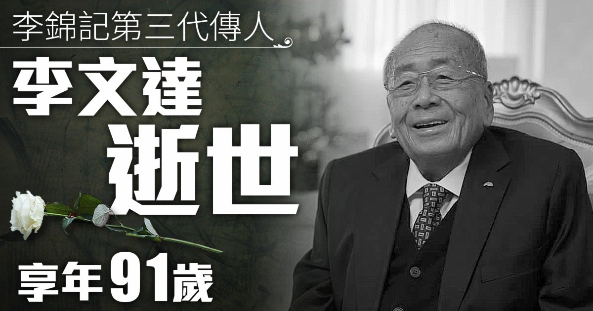 大公文匯全媒體報道,李錦記集團今日(27日)公布,李錦記家族第三代傳人、主席李文達昨日逝世,享年91歲。