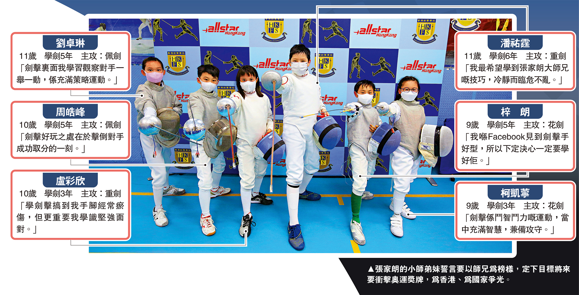 (大公報記者 方學明(文) 馬丁(圖)、陳詠韶、黎慧怡)香港「劍神」張家朗在東京奧運會個人男子花劍賽奪金後,全城迅即掀起一股「家朗」熱潮,劍擊運動受到廣泛關注,張家朗的一班小師弟、小師妹更大受鼓舞,誓言要以「家朗」師兄為榜樣,努力學習劍擊技巧,定下目標將來也要衝擊奧運獎牌,為香港、為國家爭光。