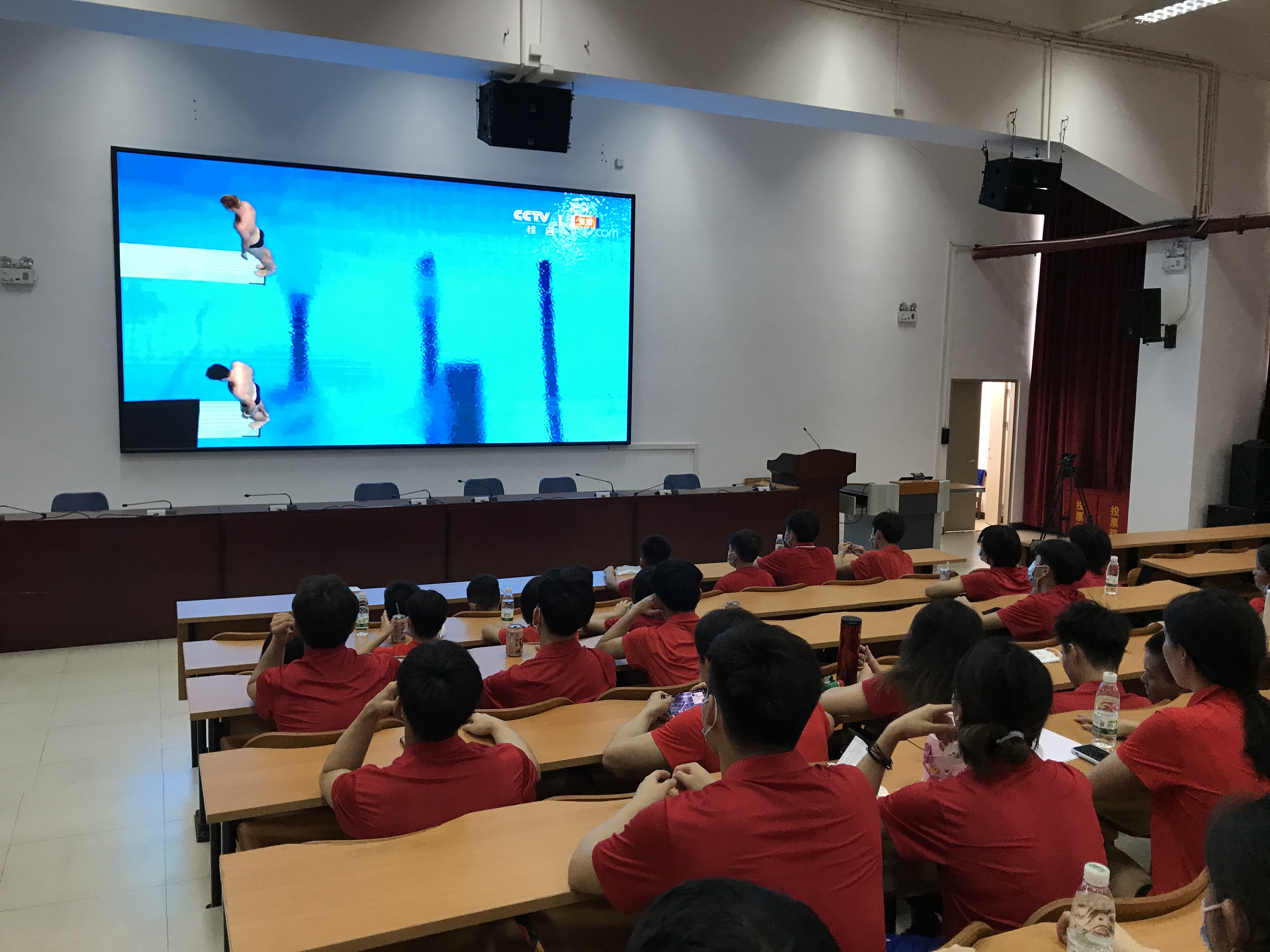 觀賽現場出現了一個小插曲,最後一跳,現場大屏幕突然黑屏無法觀看。弟子們立馬打開手機,線上視屏觀看直播。兩人奪冠,現場爆發出熱烈的掌聲。
