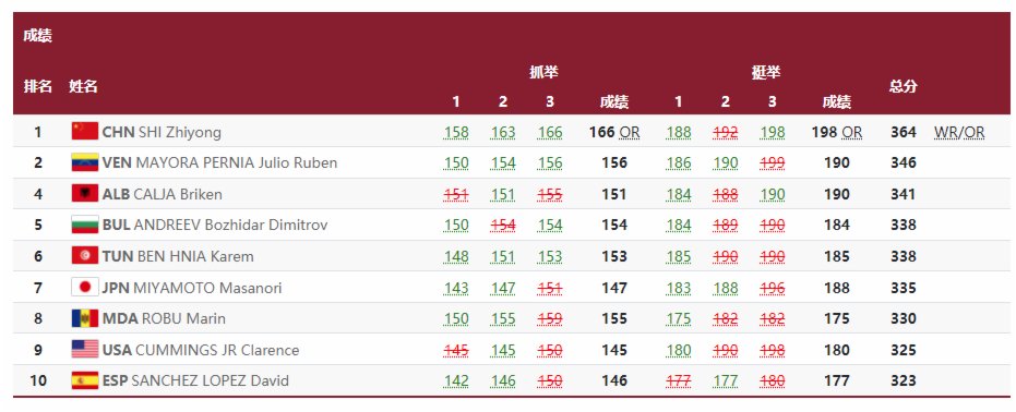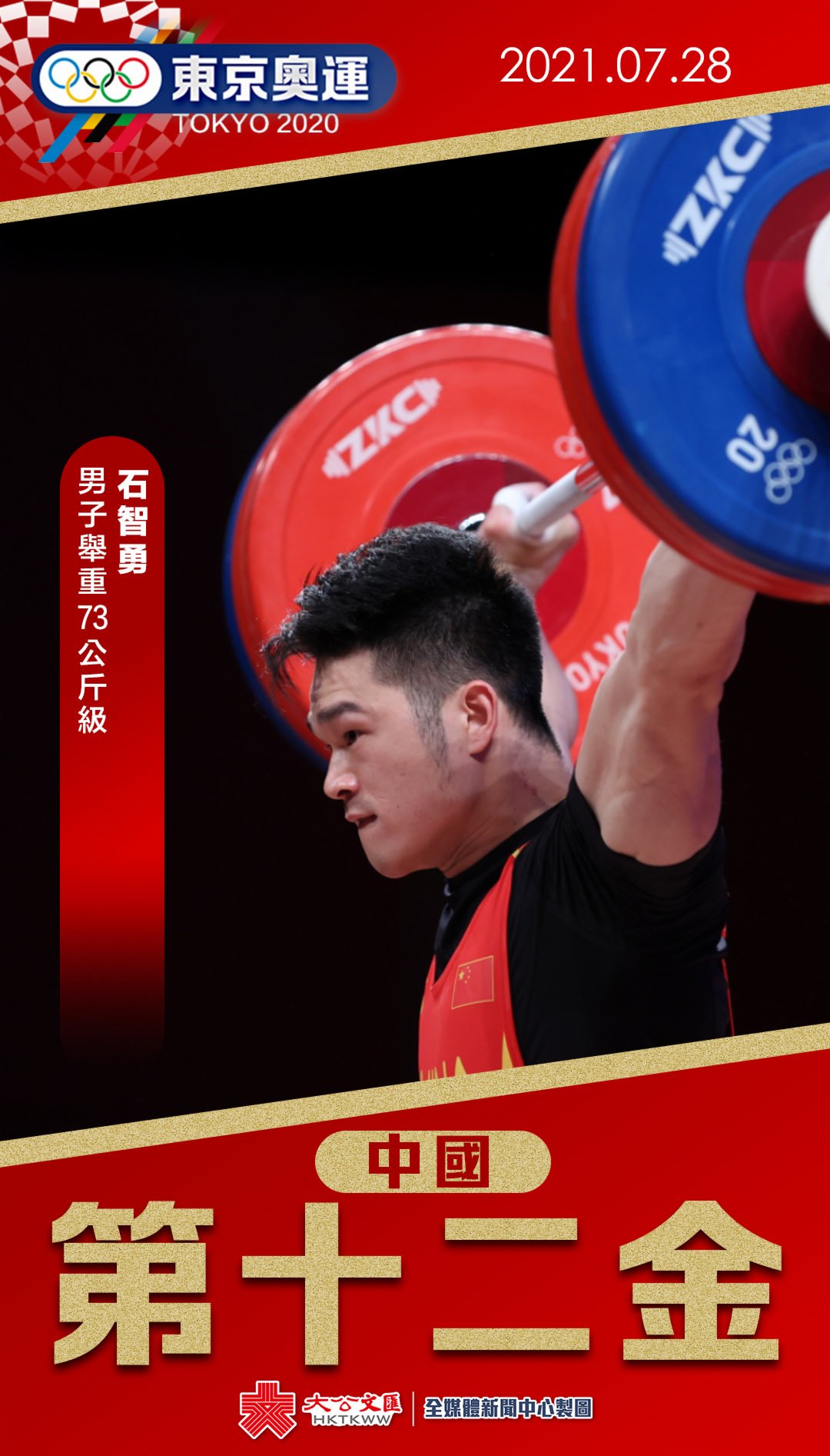 今天(28日),東京奧運會男子舉重73公斤級比賽在東京國際論壇大樓進行,中國選手石智勇以抓舉166公斤、挺舉198公斤、總成績364公斤打破自己創造的世界紀錄奪得金牌。恭喜中國舉重隊再奪一金!