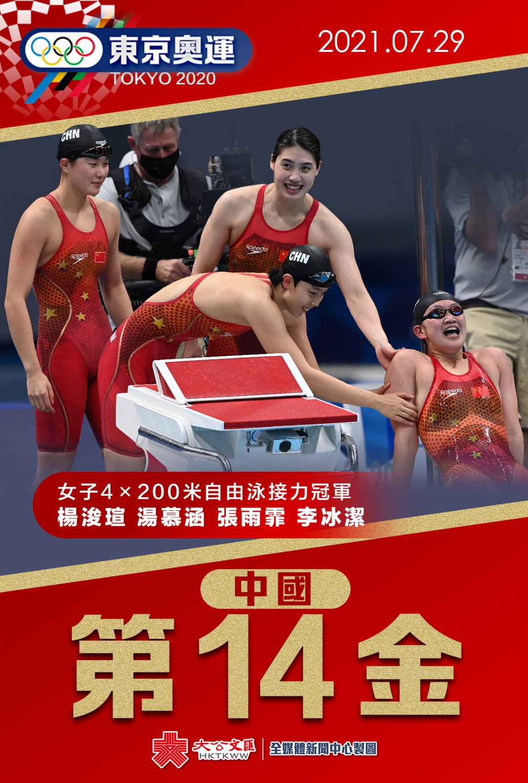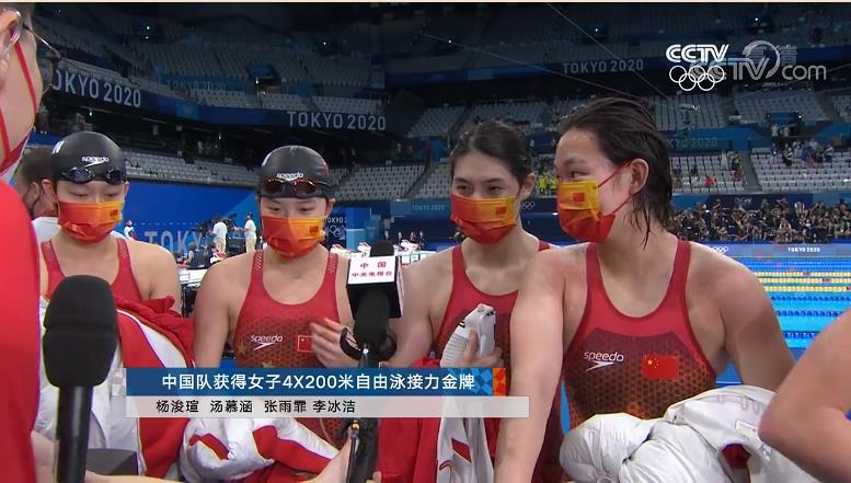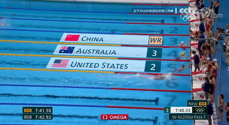 今日(7月29日),女子4×200米自由泳决赛中,中國女子組合李冰洁、杨浚瑄、张雨霏和湯慕涵以7分40秒33的成績獲得冠軍,這一成績也打破了該項目的世界紀錄。