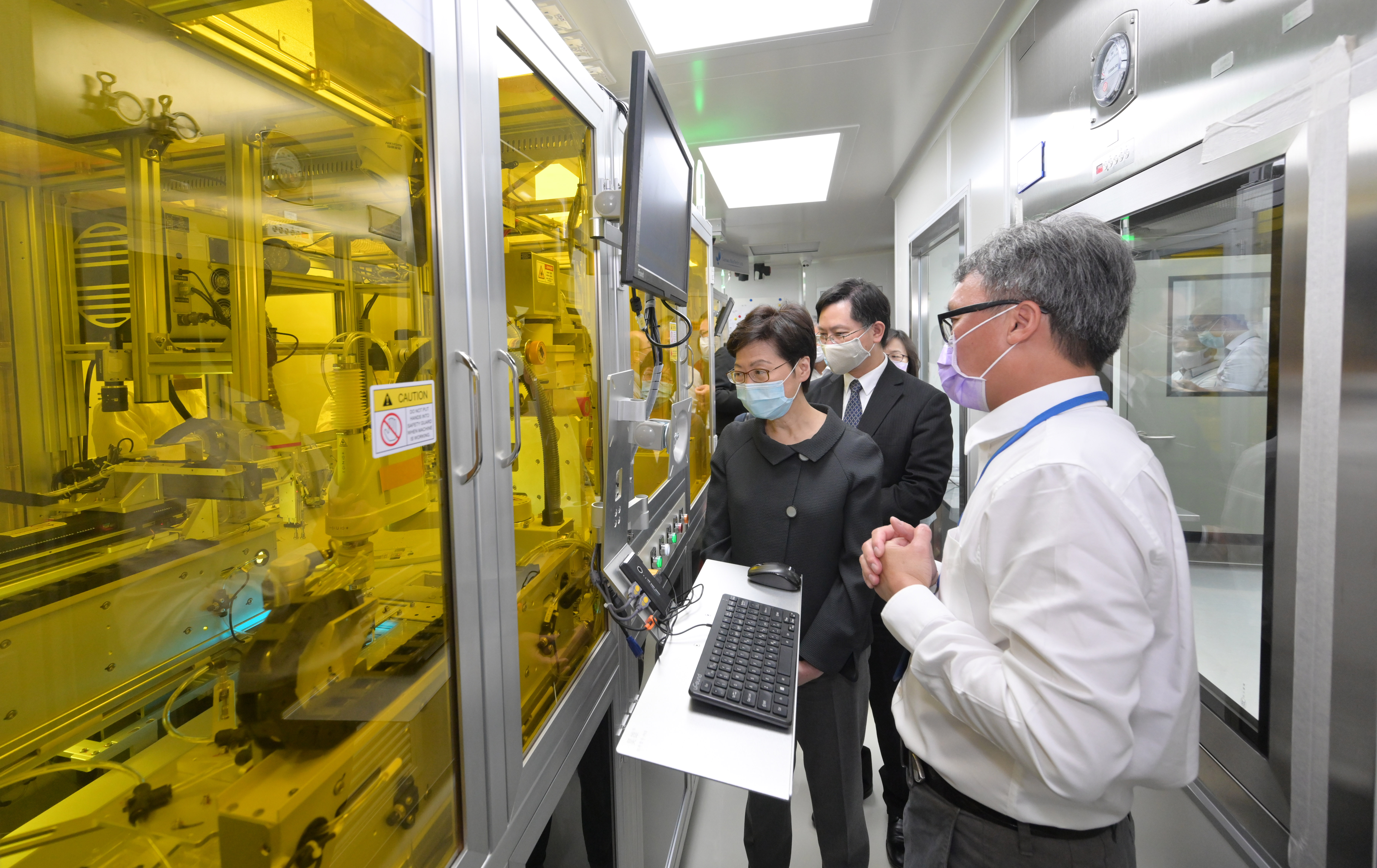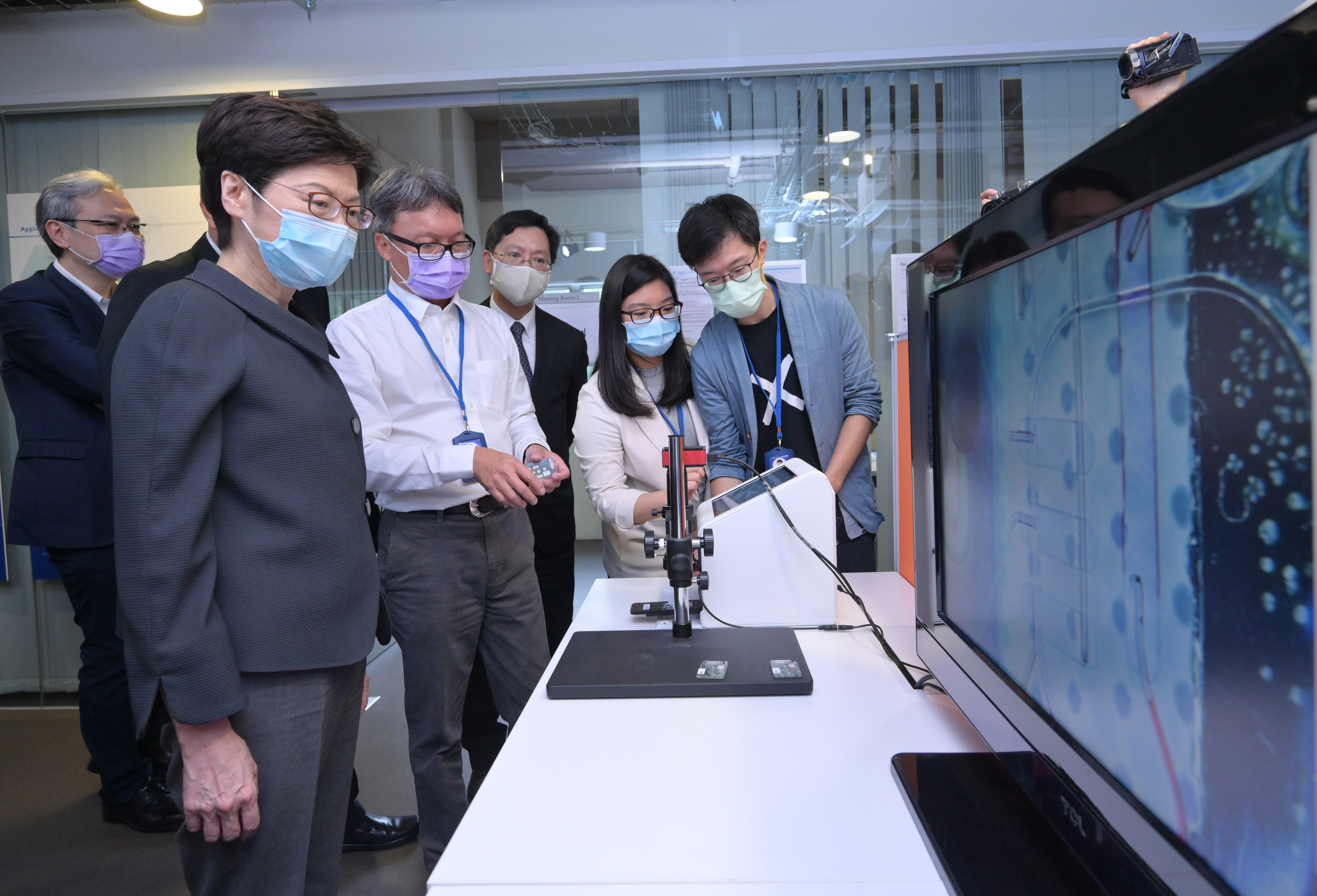 林鄭月娥在創新及科技局局長薛永恒和香港科技園公司主席查毅超陪同下,參觀該生物科技公司設於火炭廠房的研發設施和自動化生產線,並聽取負責人員介紹其研發項目以及產品商業化的進度。該初創是香港科技園公司的夥伴公司,它研發的便攜式檢測儀器只需將微量樣本放在細小的晶片上,便能於15分鐘內檢測出特定病毒,方便醫護員即場進行檢測,及早作出診斷。