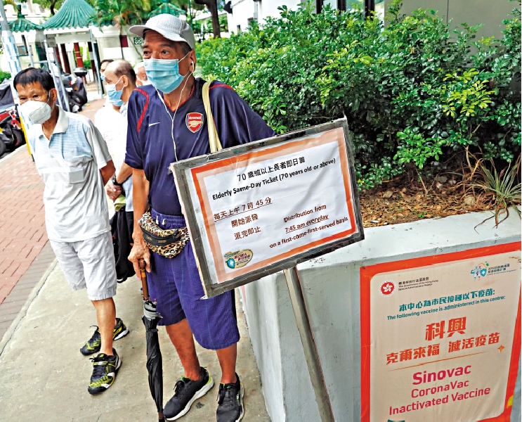 雖然政府呼籲長者無需過早排隊等候,但在多個社區接種中心外,昨日一早便有不少長者排隊。在接種科興疫苗的官涌體育館,有排頭位的長者昨早六時許已到場,他說因為不懂上網登記,又不想麻煩家人,便提早到來等候領取「即日籌」。有取得「即日籌」完成接種的長者認為,網上預約打針填寫資料繁多,「即日籌」很方便,場內有分流,安排有序,等候約十多分鐘就能接種。