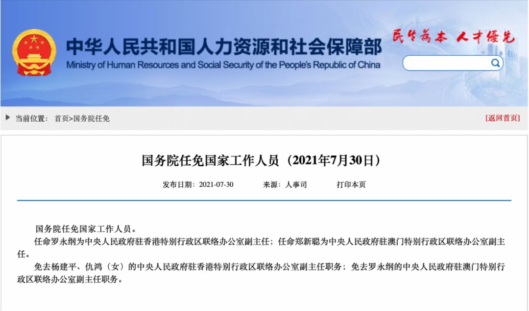 免去楊建平、仇鴻(女)的中央人民政府駐香港特別行政區聯絡辦公室副主任職務;免去羅永綱的中央人民政府駐澳門特別行政區聯絡辦公室副主任職務。