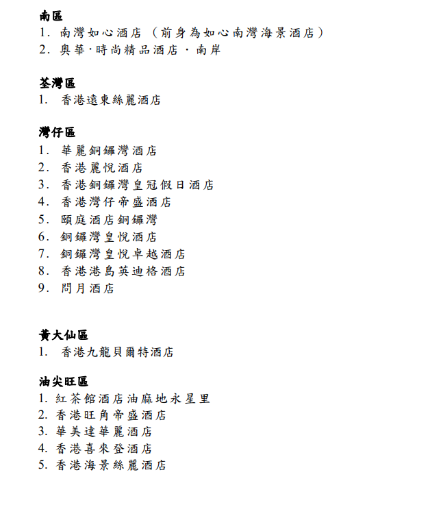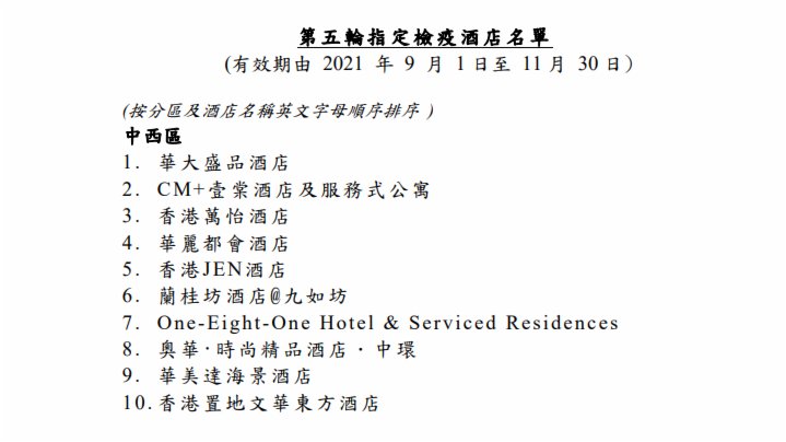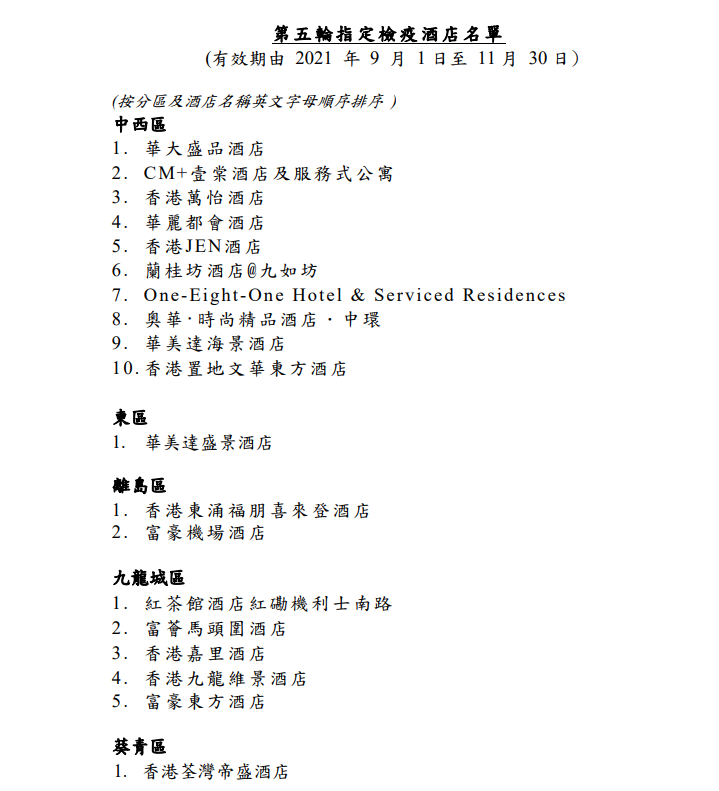 政府發言人表示,當局於本月16日發信邀請約2000間持有效牌照的酒店或旅館,申請為第五輪指定檢疫酒店,共收到44個申請。經評估後,揀選37間作為第五輪指定檢疫酒店,供從內地及澳門以外地區抵港人士選擇入住。名單中包括33間屬第四輪指定檢疫酒店。