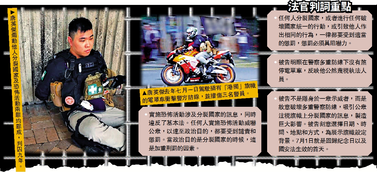 法官在判詞強調,唐英傑故意選擇在7月1日回歸紀念日及國安法首天生效日犯法,明顯是刻意挑戰法律與秩序,案情屬於情節嚴重。任何人分裂國家,或者進行任何破壞國家統一的行動,或引致他人作出相同的行為,一律都要受到適當的懲罰,懲罰必須具阻嚇力。