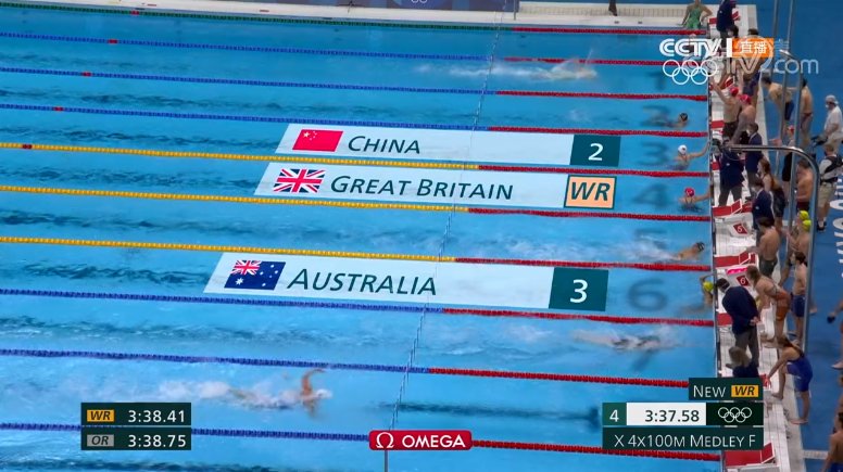 第一棒徐嘉余與美國選手不相上下,仰泳保持第三位,第二棒閆子貝蛙泳超到第二位,第三棒張雨霏蝶泳0秒32交棒越到第一位,後被英國選手蓋伊超越,第四棒楊浚瑄自由泳保持優勢,最終以3分38秒86的成績獲得亞軍。