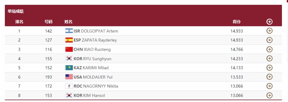 今日(1日),東京奧運會男子個人自由體操決賽在有明競技體育場進行,中國選手肖若騰以14.766分奪得銅牌,同時肖若騰個人動作完成分為全場最高,恭喜中國體操隊!