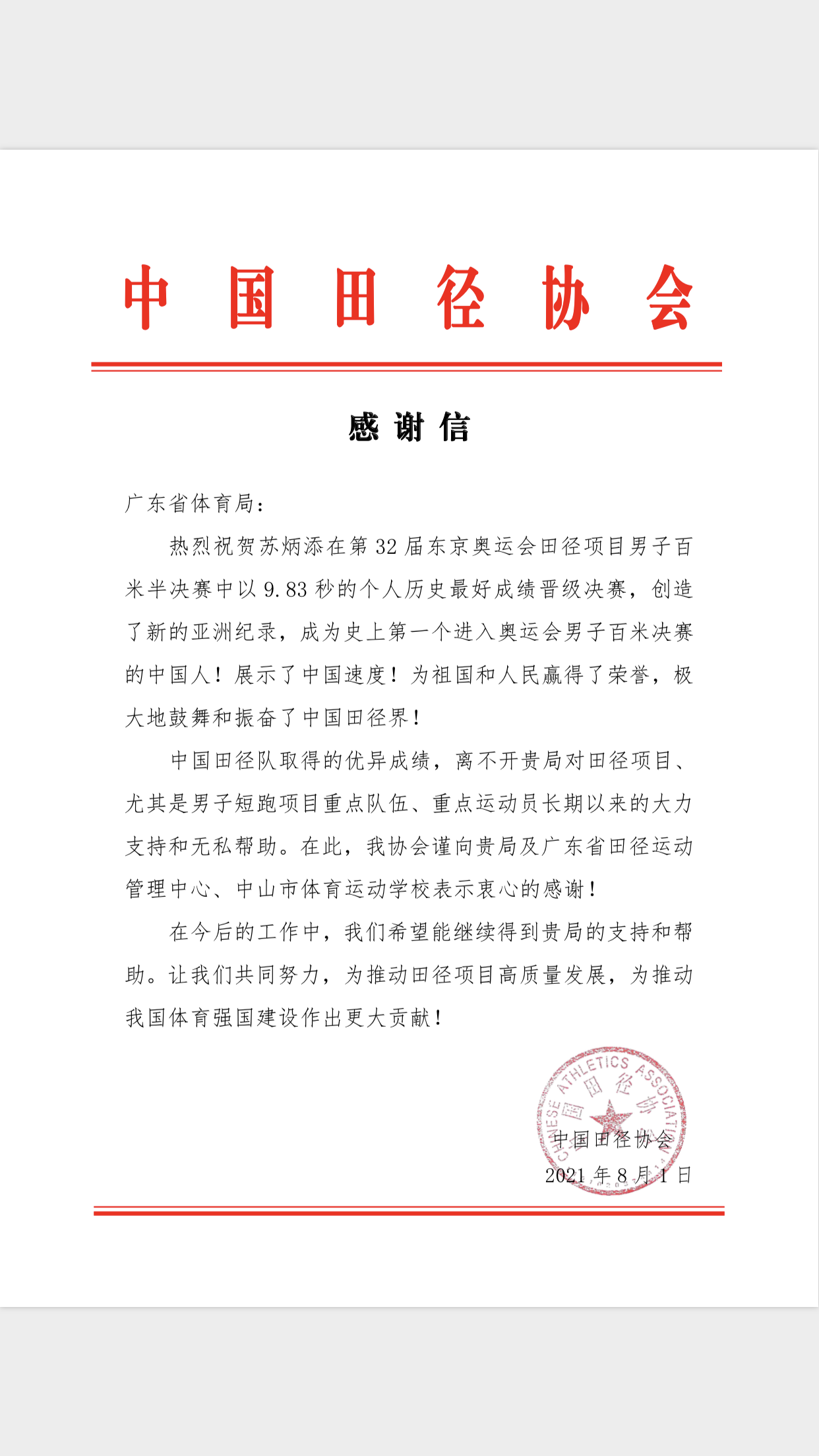 (大公文匯網 記者 敖敏輝 )1日晚,在東京奧運會田徑男子100米決賽「飛人大戰」中,打破亞洲記錄並實現中國人首次闖入奧運會男子百米決賽的短跑名將蘇炳添,獲得第六名。雖然沒有拿到獎牌,但仍創造了歷史,奧運會男子100米決賽寫下了中國人的名字、中國人的成績。賽後,中國田徑協會向廣東省體育局發去感謝信,稱蘇炳添「展示了中國速度!為祖國和人民贏得了榮譽,極大地鼓舞和振奮了中國田徑界!」