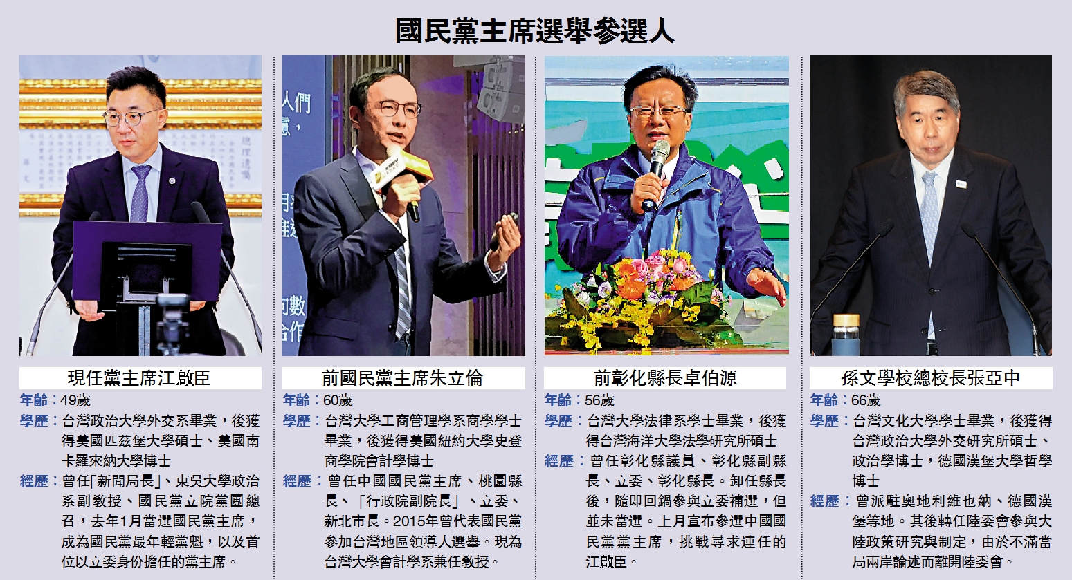 大公報綜合新華社及中通社報道,中國國民黨主席改選在疫情三級警戒降級後重啟,8月12日、13日辦理領表,16日、17日受理登記,投票日訂於9月25日。目前除現任黨主席江啟臣尋求連任外,還有孫文學校總校長張亞中、前彰化縣縣長卓伯源宣布參選,加上朱立倫,已有4人加入角逐。