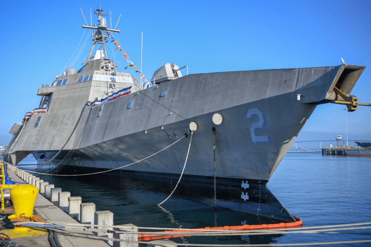 瀕海戰鬥艦是美國海軍在21世紀初推出的全新艦艇,意圖取代傳統的護衛艦、掃雷艦、巡邏艦等多種艦艇,具備低成本、多用途、模塊化、機動靈活的特性,能憑藉隱形優勢在敵方的沿海淺水區作戰,並通過數據鏈引導已方主力艦實施遠程打擊。該艦從設計之處就極有科幻色彩,分別採用了兩種截然不同的設計——傳統艦型的「自由」級和三體船型的「獨立」級。