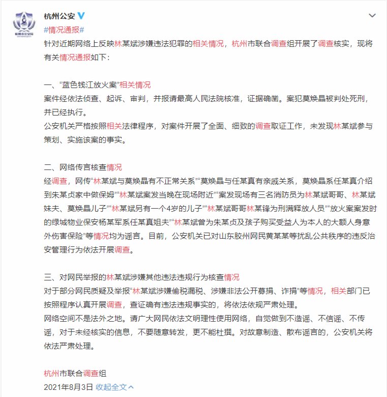 大公文匯網報道,針對近期網絡上反映林某斌涉嫌違法犯罪的相關情況,杭州公安今日(3日)發布消息稱,未發現林某斌參與策劃、實施「縱火案」的事實;對於部分網民質疑及舉報「林某斌涉嫌偷稅漏稅、涉嫌非法公開募捐、詐捐」等情況,已按程序開展調查,查證確有違法違規事實的,將依法依規嚴肅處理。
