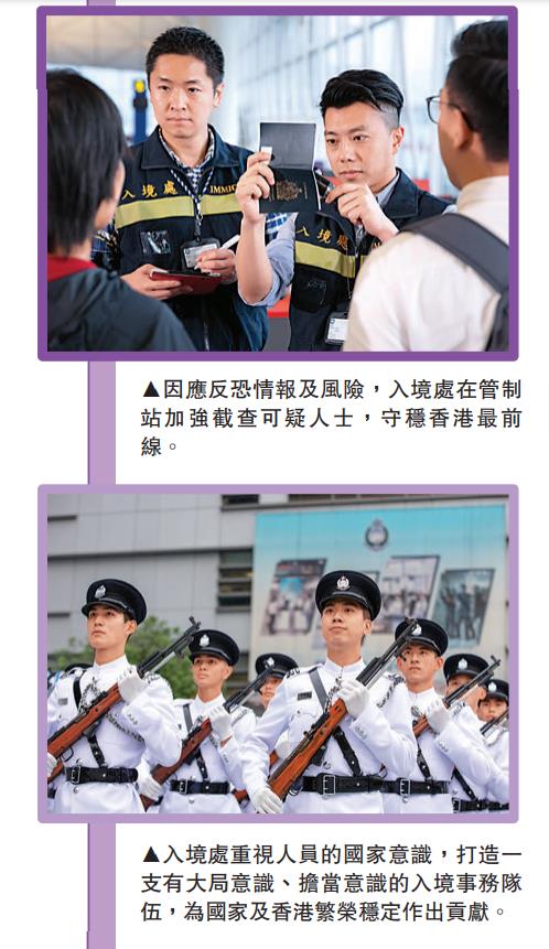 作為香港紀律部隊的先驅,回歸不久,入境處在1999年率先引入中式步操,在部門儀式中演示,愛國愛港的種子已深植每位入境處成員當中。為進一步加強入境處人員的國家意識,於去年10月起,所有新入職的入境事務隊成員均接受中式步操訓練。入境處助理處長(管理及支援)戴志源指,除了中式步操、國情教育,包括認識國家《憲法》、《基本法》亦已納入入職訓練課程當中:「作為公務員隊伍及特區政府其中一支紀律部隊,入境處人員必須愛國愛港,奉公守法,擁護『一國兩制』及《基本法》,支持特區政府依法施政。」隨着《香港國安法》的實施,戴志源希望透過各項培訓,令入境處人員充分明白國家安全的重要性,從心態上到日常職務上,均以維護國家安全為己任,時刻保持頭腦清醒,堅定立場,把握正確的方向。戴志源補充指:「我們的目標是打造一支有國家意識、大局意識、擔當意識的入境事務隊伍,為國家及香港繁榮穩定作出貢獻。」