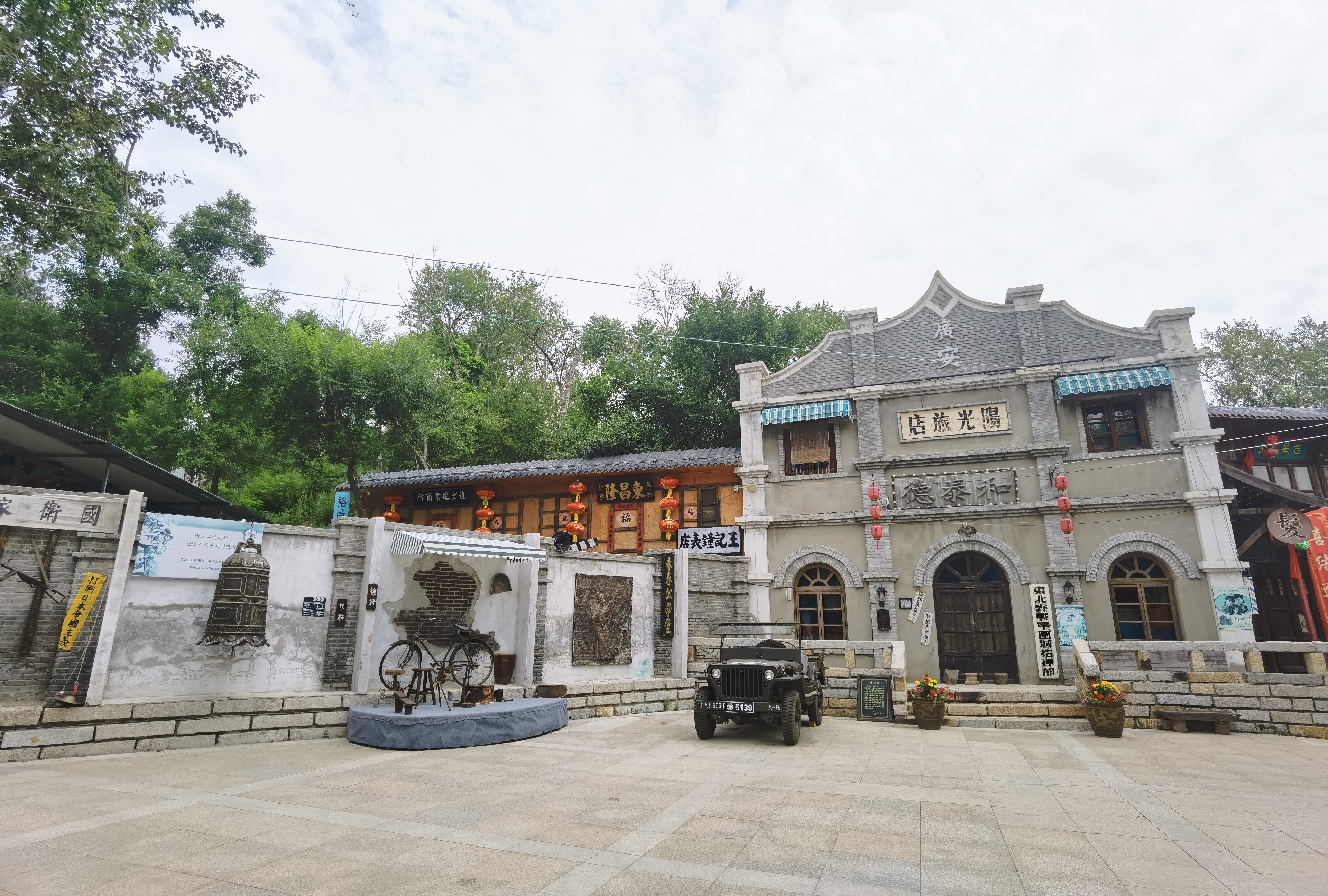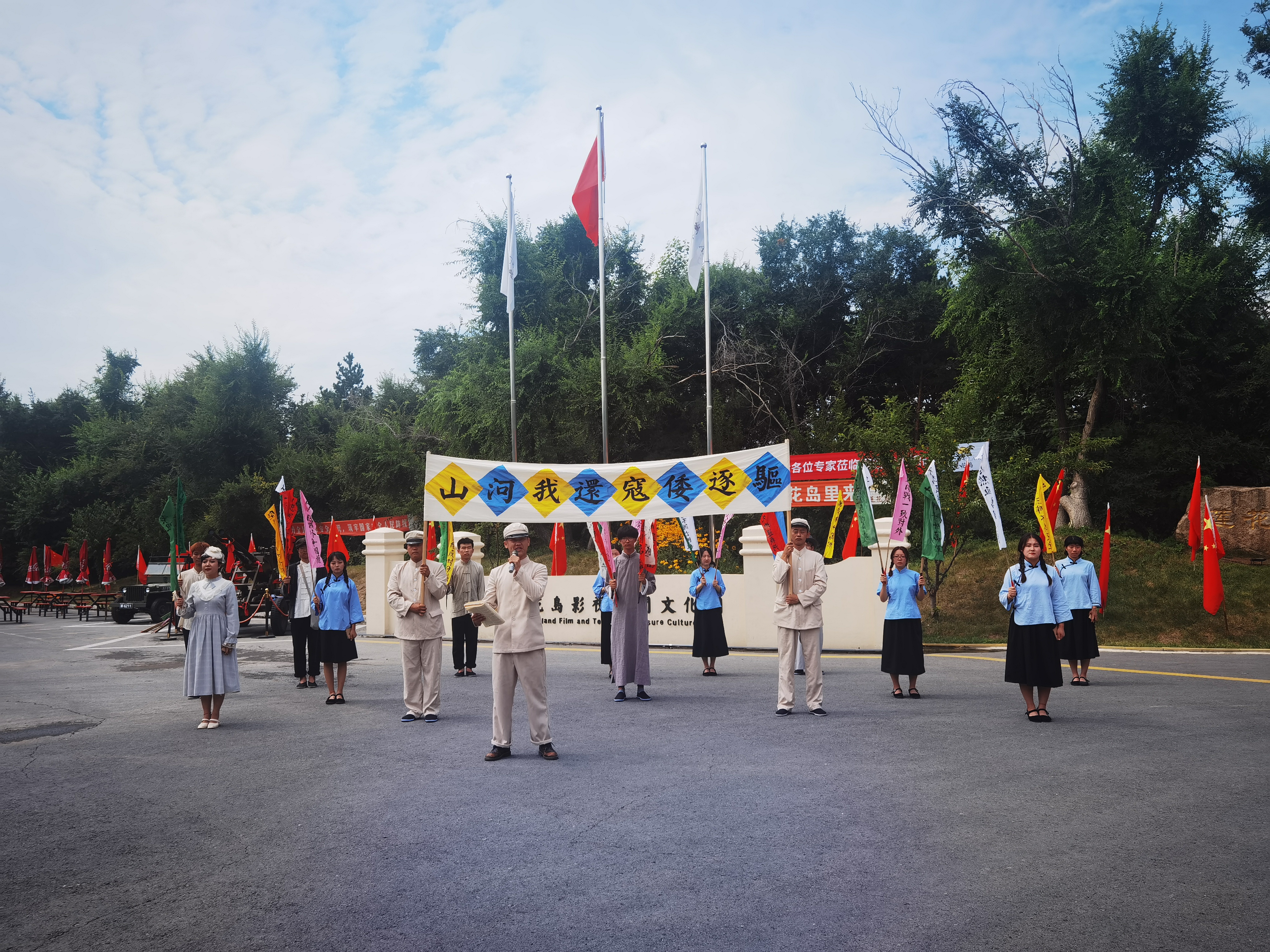 (大公文匯網記者 朱燁 吉林報道)記者一行剛走進吉林省長春蓮花島影視休閒文化園,便被眼前的景象驚呆了。一條條「驅逐倭寇 還我河山」的橫幅、群情激奮呼喊着口號的民國學生們、帶着濃重歷史痕迹的招兵處還有那弓腰彎腿的東北老兵們,一瞬間彷彿穿越回了那個炮火紛飛的激情歲月,又彷彿置身於電視劇拍攝片場。學生們喊着口號將彩色旗幟遞到記者手中,激動地呼喊:「請加入我們吧!」原來,這是文化園每日都會上演的沉浸式演出,真實再現了面對敵寇保家衛國的愛國情懷,而這種體驗不由得讓人感到興奮又新奇。