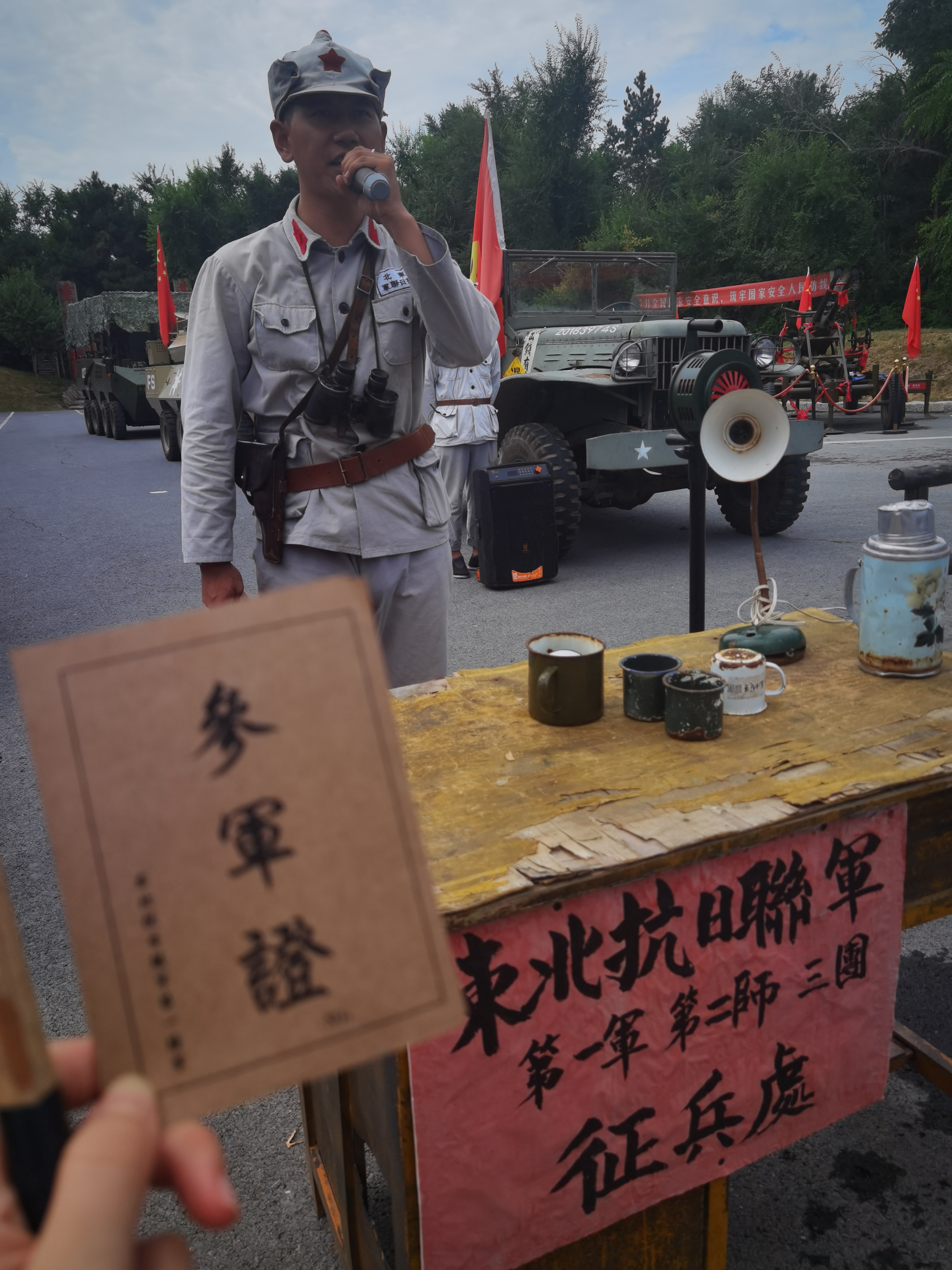 先是學生領袖鼓舞人心的演講,緊接着記者一行便拿到了「參軍證」,憑藉此證可以到東北抗日聯軍第一路軍的招兵處簽字,領取屬於自己的第一桿槍。隨後,還可帶着槍支登上不同樣式的軍車,環遊景區,學生們將會跟在軍車後面,一路呼喚標語,體驗感極強。