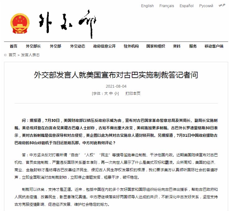 發言人指,中方堅決反對打着所謂「自由」「人權」「民主」等旗號濫施單邊制裁、干涉他國內政。近期美國陸續宣布對古巴機構、官員實施制裁,嚴重違反國際關係基本準則,再一次向世人展示了什麼是美式雙標和霸凌。眾所周知,美國的經濟、商業、金融封鎖才是妨礙古巴改善經濟民生、侵犯古人民生存權發展權的根源,我們要求美方認真傾聽國際社會的普遍呼聲,立即全面取消對古制裁封鎖,立即停止借題發揮,粗暴干涉,破壞穩定。