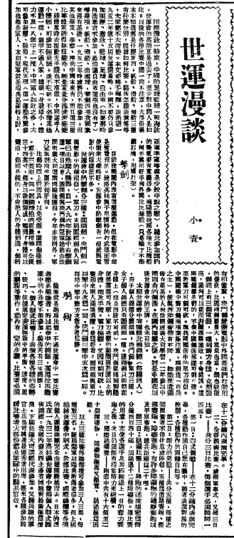 左下方則是《世運漫談》專欄,署名「小查」,其實就是當時的大公報編輯、後來的武俠大師金庸(查良鏞)。這個專欄在奧運會期間,負責向讀者科普奧運項目的相關競技規則。15日的這一期重點介紹了劍擊、騎術兩個項目。關於劍擊,第一句就是「目前我國國內沒有這種運動」。