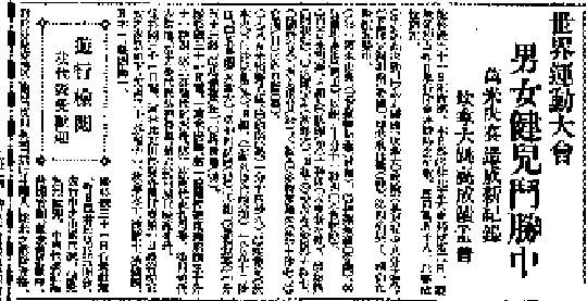 比賽前半程,中國隊陸續出場。世運特刊的頭條,大多數是聚焦中國選手的成績。8月4日《女子百米賽,李森未上名》,報道中國唯一女選手李森被淘汰。6日,男子撐竿跳《符保廬預賽及格,不幸決賽落選》;7日,《中英足球賽,二比零失敗》;8日《十九比三十五,我籃球慘敗》,大標題上方還特意冠以「傳球不穩,發球不準」八字,簡明扼要點出了失敗原因。