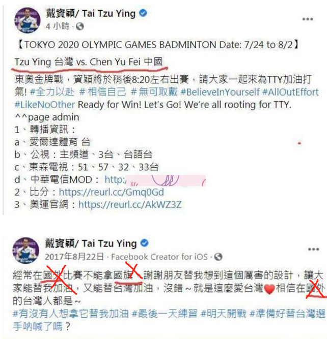 台灣選手戴資穎在社交媒體上充斥着各種「台獨」言論。他經常將台灣與中國並列,並稱中國為「國外」,稱自己因不能拿台灣「國旗」比賽而感到遺憾。
