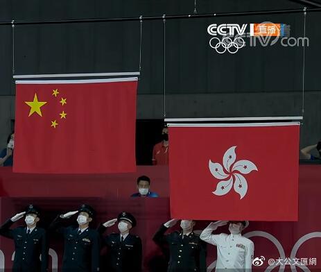 在頒獎禮上,國家隊站中間,中國香港隊站旁邊,東京奧運賽場上奏響國歌,中國國旗和香港特區區旗同時升起。