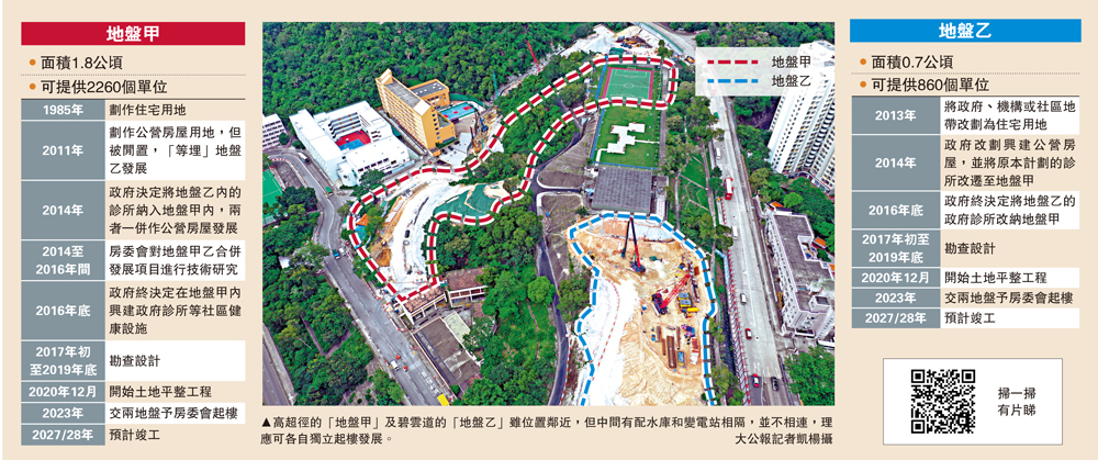 高超徑的「地盤甲」及碧雲道的「地盤乙」雖位置鄰近,但中間有配水庫和變電站相隔,並不相連,理應可各自獨立起樓發展。不過,記者翻查紀錄,卻發現兩幅官地遲遲未有動工,而是反反覆覆徘徊在基建設計及規劃流程。