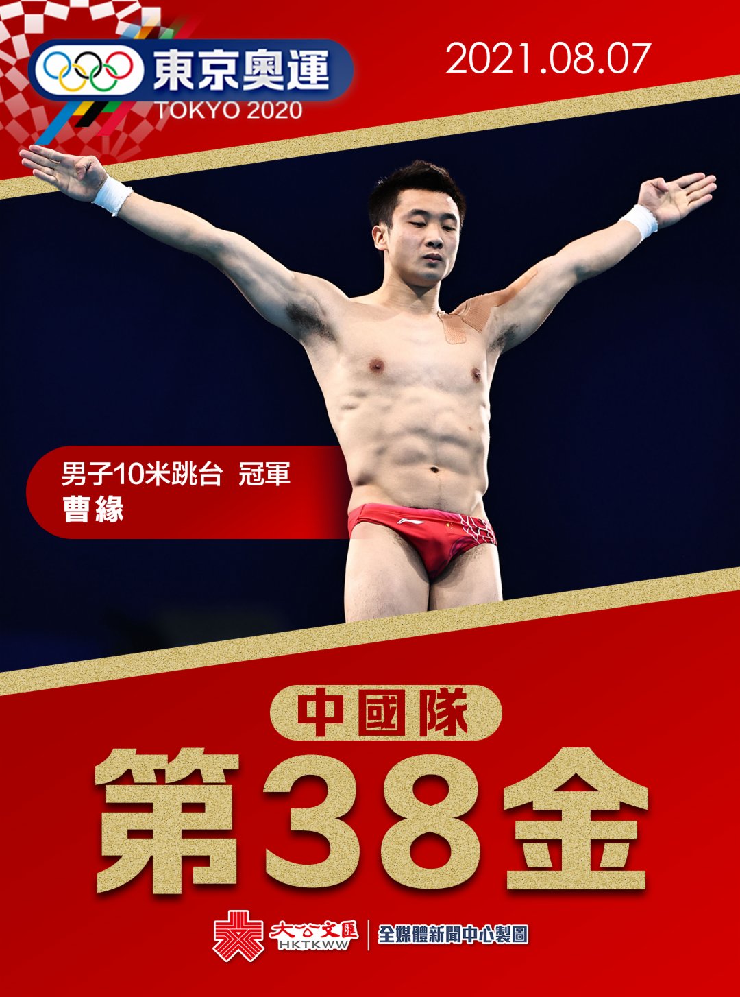 大公文匯網報道,今日(8月7日),男子10米跳台中國選手曹緣楊健包攬金銀,曹緣為中國代表團斬獲第三十八金。