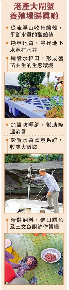 (大公報記者 馮錫雄(文)凱 楊(圖))港人每年吃掉1300萬隻大閘蟹,今年10月終於可以品嘗港產的大閘蟹。有環保科技公司斥資2000萬元,活化新界多個荒廢魚塘成為大閘蟹養殖場,場內架設遮光網降溫,並引入地下水確保水質清澈,塘底鋪上膠板種稻形成「蟹稻共生」自然生態環境,配合紀錄儀監察水質、水溫和酸鹼值提高產量,確保港產大閘蟹「住好啲」兼健康成長。