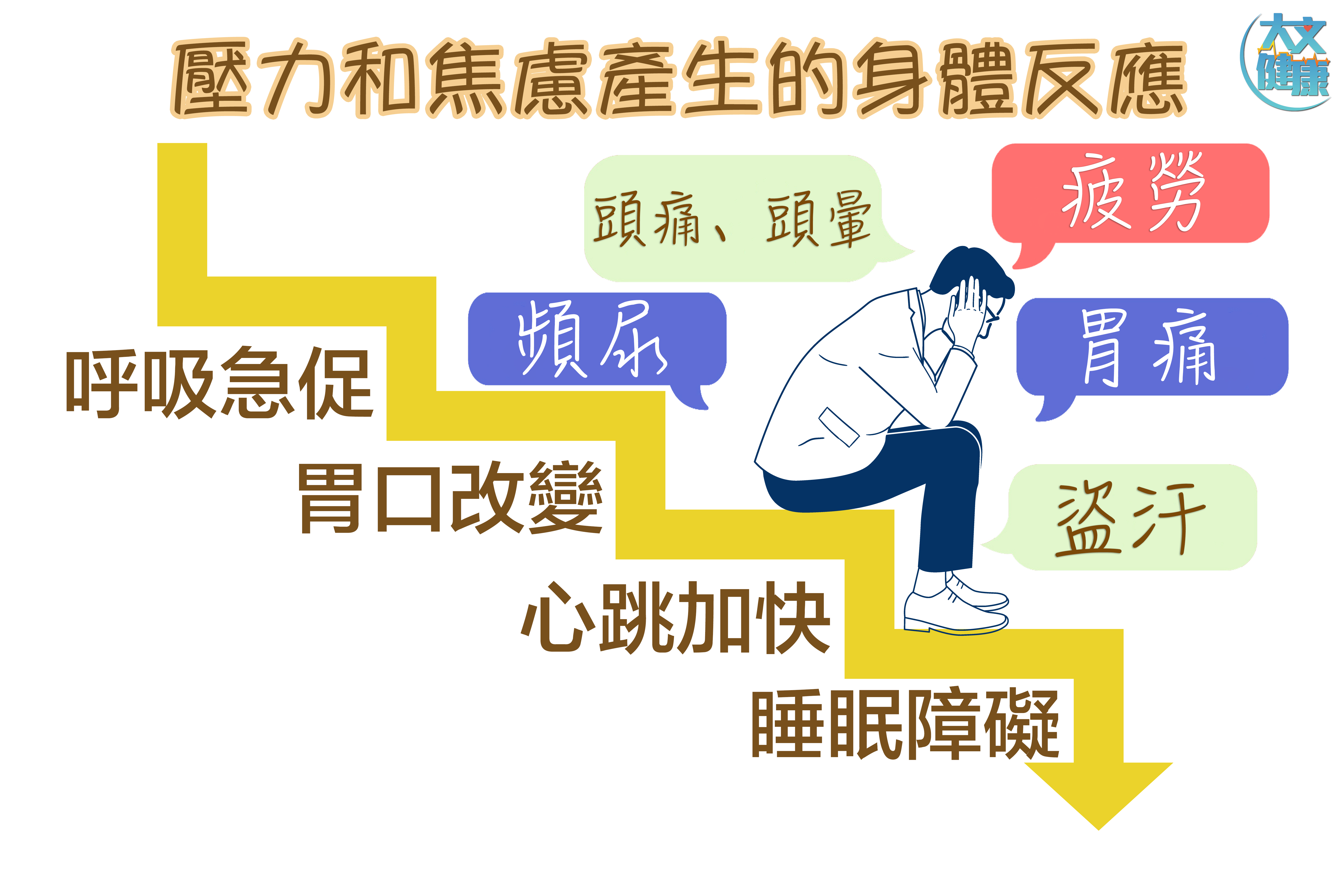 壓力和焦慮的會產生部分身體反應,因人而異,以下為常見的生理症狀: