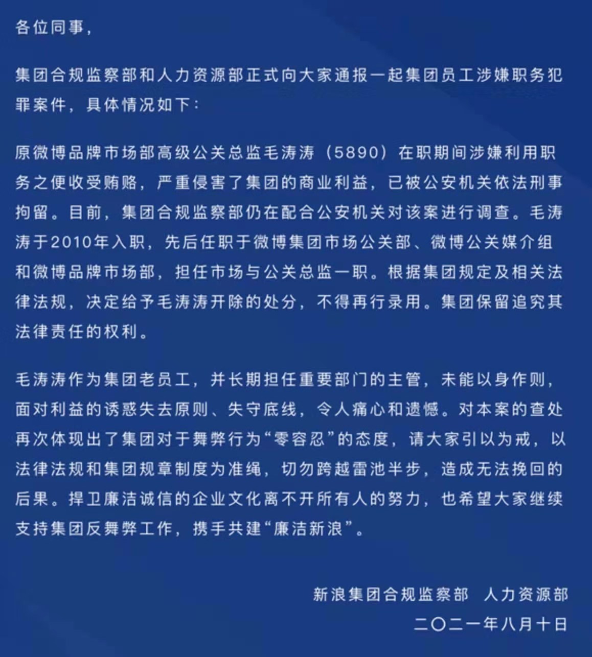 通報稱,毛濤濤作為新浪集團老員工,並長期擔任重要部門的主管,未能以身作則,面對利益的誘惑失去原則、失守底線,令人痛心和遺憾。對本案的查處再次體現出了集團對於舞弊行為「零容忍」的態度,請大家引以為戒,以法律法規和集團規章制度為準繩,切勿跨越雷池半步,造成無法挽回的後果。