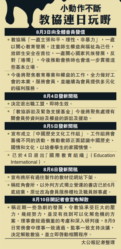 不過,《大公報》翻查資料發現,根據教協《章程》,「必須有全體合格會員三分之二或以上以秘密投票表示同意方得解散」,換言之教協倉促解散,涉嫌違章。