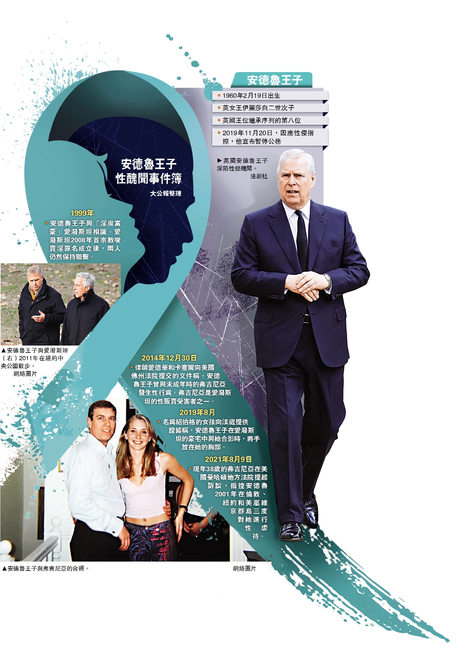 大公報綜合美國廣播公司、《每日郵報》、BBC報道:英國王室性醜聞再度發酵,「淫魔富豪」愛潑斯坦性販賣案受害者弗吉尼亞9日向曼哈頓聯邦法院正式提起訴訟,指控英國安德魯王子曾在2001年對當時未成年的她實施多達三次性侵犯及虐待。弗吉尼亞表示,權貴不能凌駕法律之上,她希望通過這次訴訟,鼓勵其他性侵受害人伸張正義並重獲新生。