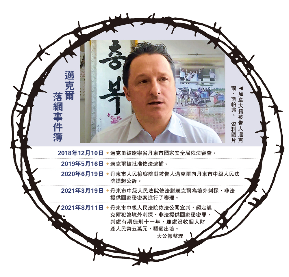 8月11日,丹東市中級人民法院依法公開宣判,認定邁克爾犯為境外刺探、非法提供國家秘密罪,判處有期徒刑十一年,並處沒收個人財產人民幣五萬元,驅逐出境。