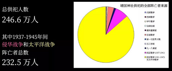 其後,日本開始了對外擴張的腳步,在歷次海外侵略戰爭中死掉的軍人、軍屬也被入冊,供奉於此。靖國神社供奉的246.6萬人當中,戰死於侵華戰爭和太平洋戰爭的有232.5萬人,超過了總死亡人數的94%。